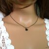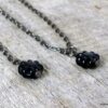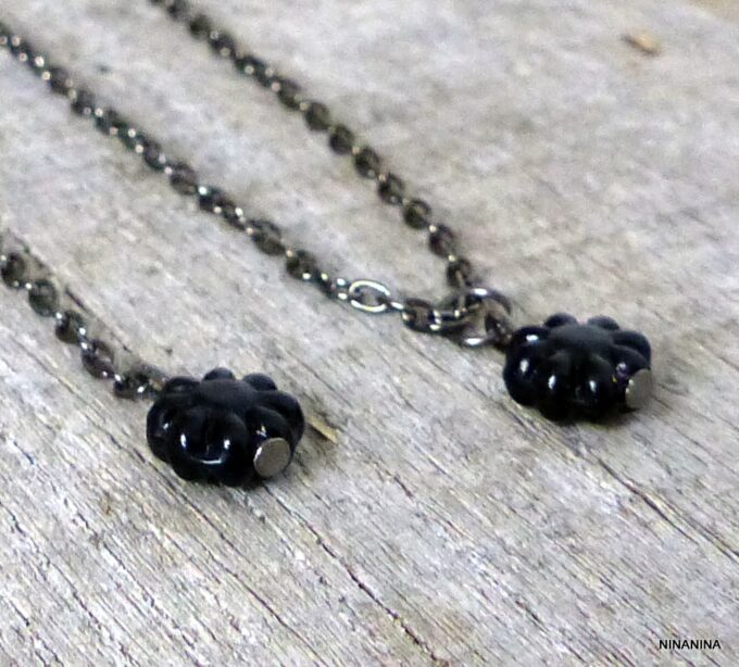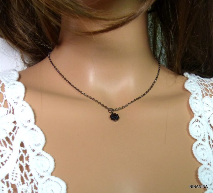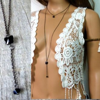 Collier de dos métal noir fleur cristal de boheme composé de deux petites fleurs en cristal de boheme noir montées sur une fine chainette en métal noir. Dim de la fleur :1 X 1 cm. Longueur (fermoir compris) : 40 cm environ . Longueur de la chaine de dos : 30 cm environ. Fermoir mousqueton. Livré dans sa pochette d’organza. Bijou 100% fait-main.
