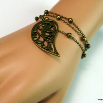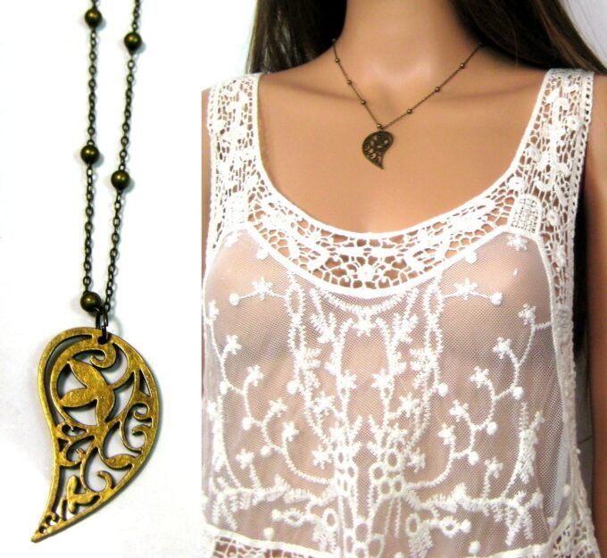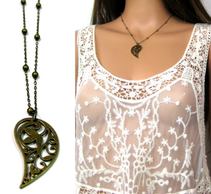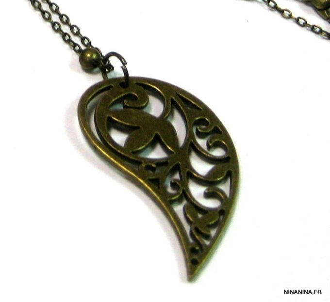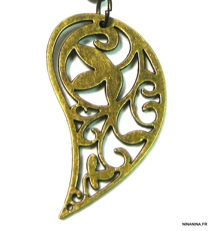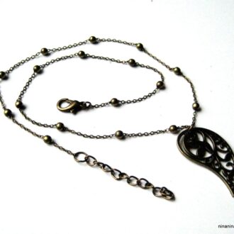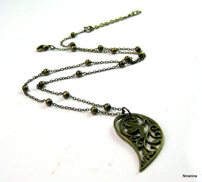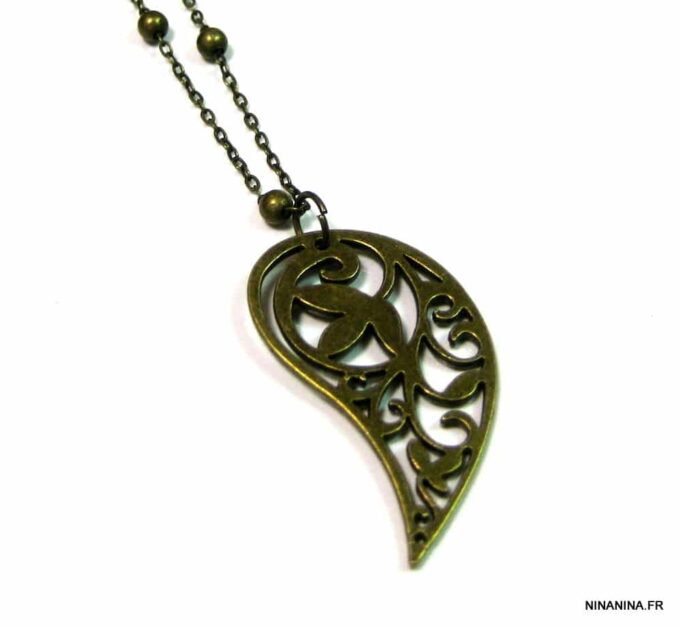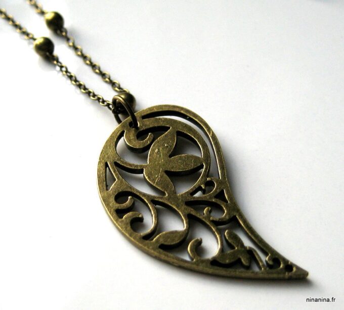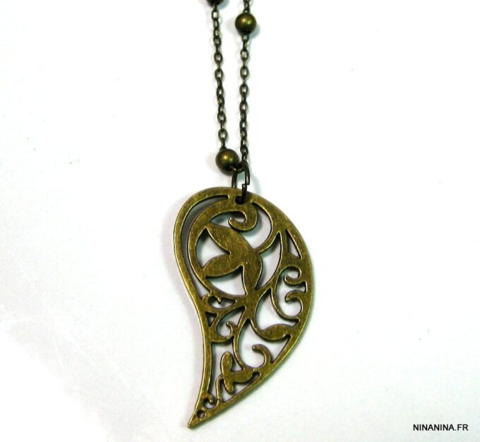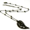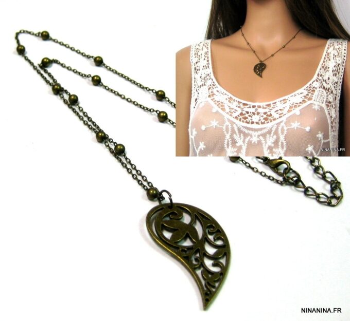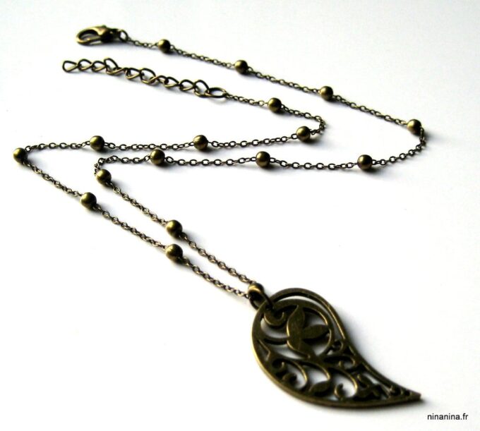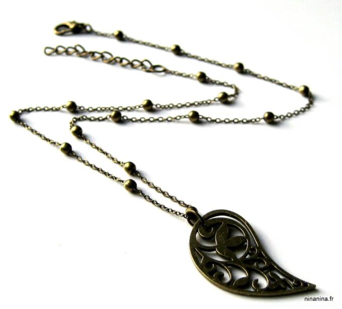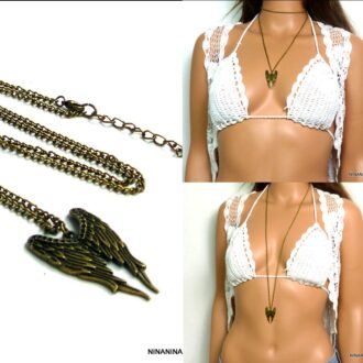 Collier court métal bronze composé d’un pendentif aile d’ange en métal bronze monté sur une chainette en métal bronze. Dim du pendentif : 3,6 x 2 cm. Longueur (fermoir compris) : 45 cm environ. Fermoir mousqueton et chainette de rallongement. Livré dans sa pochette d’organza. Bijou 100% fait-main