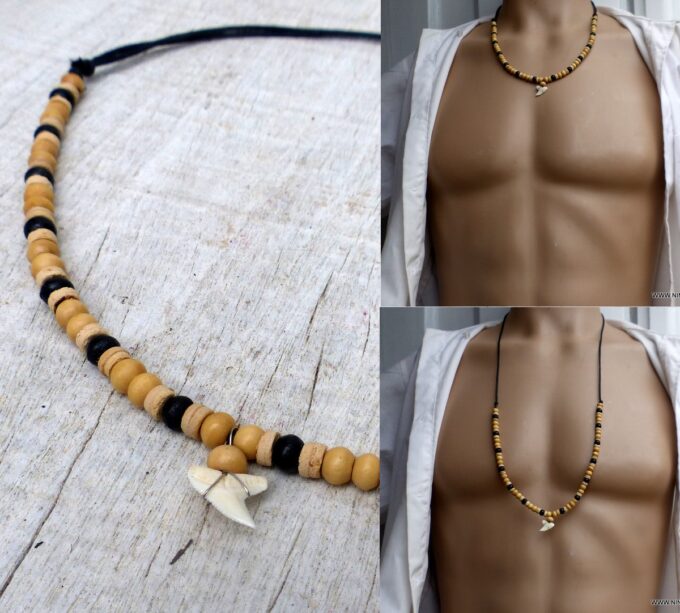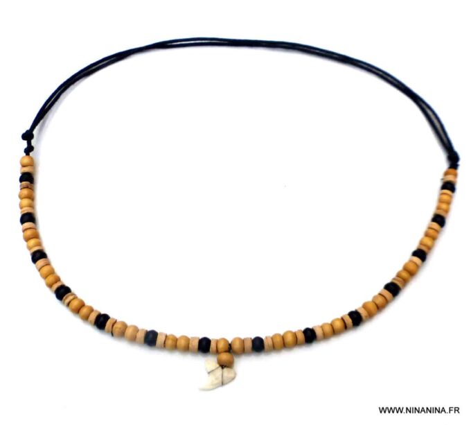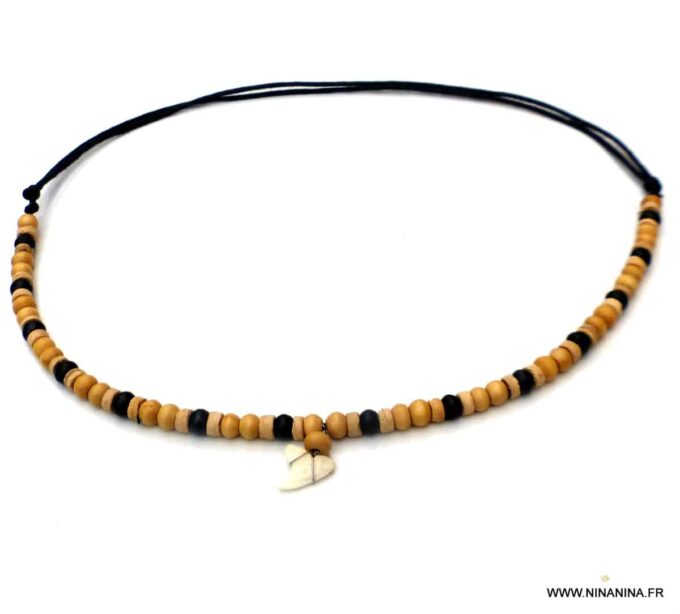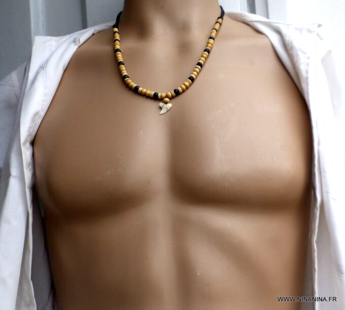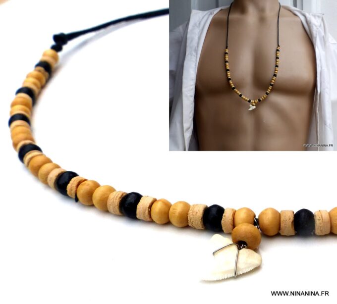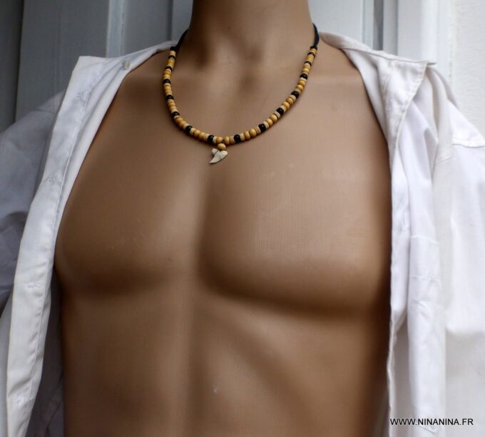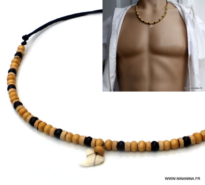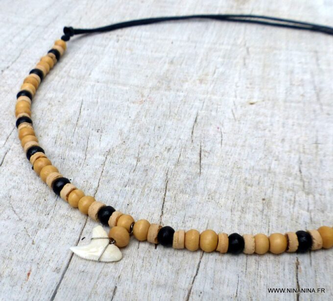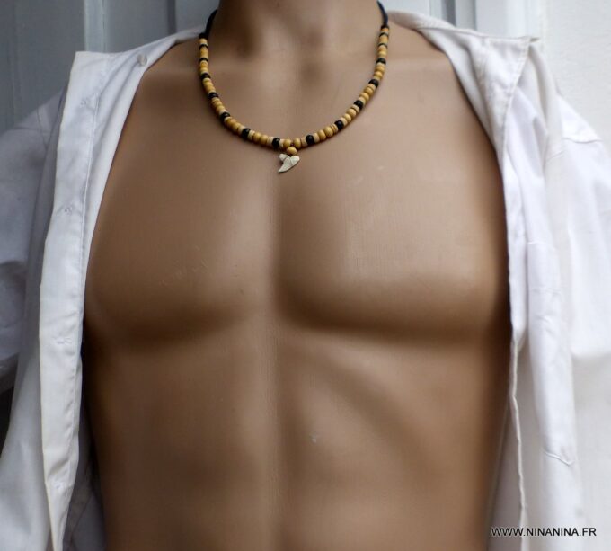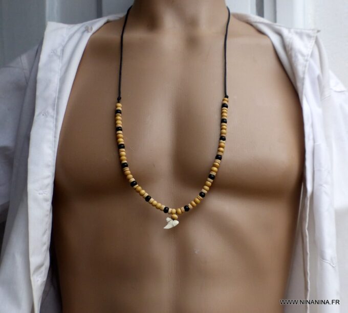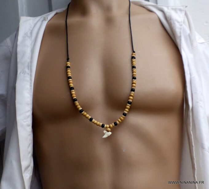 Entre bijou porte bonheur et symbole de virilité, ce Collier ethnique bois homme pendentif Dent de requin constitué d’une dent de requin mako véritable et de perles de bois rondes blanches et noires montées sur un cordon de coton ciré noir va vous faire craquer à coup sûr!