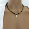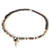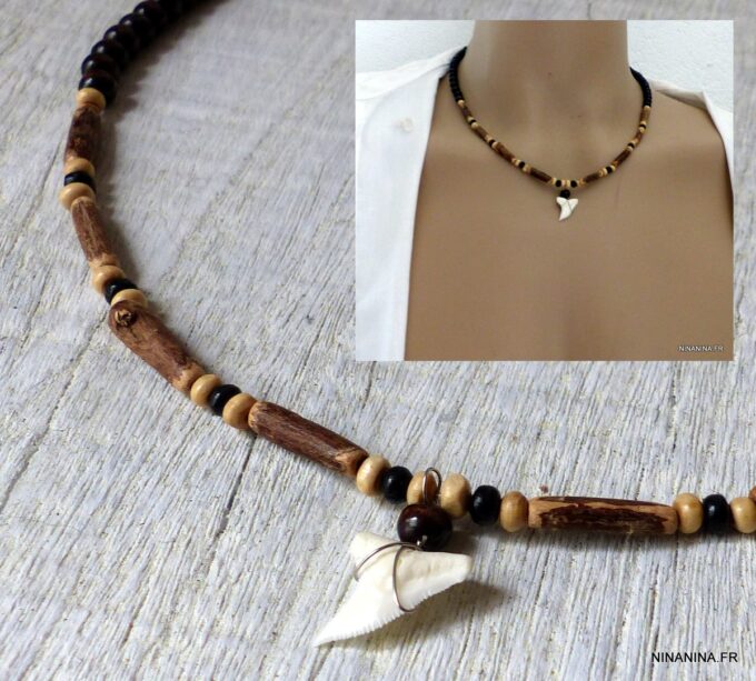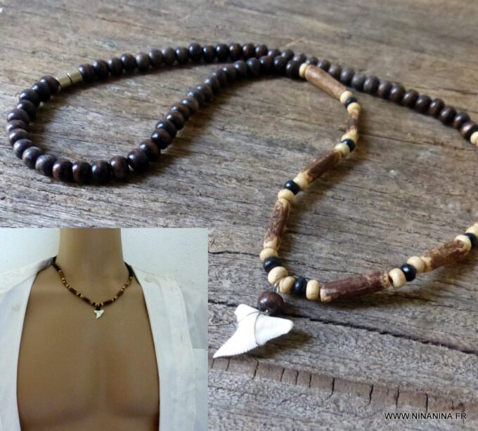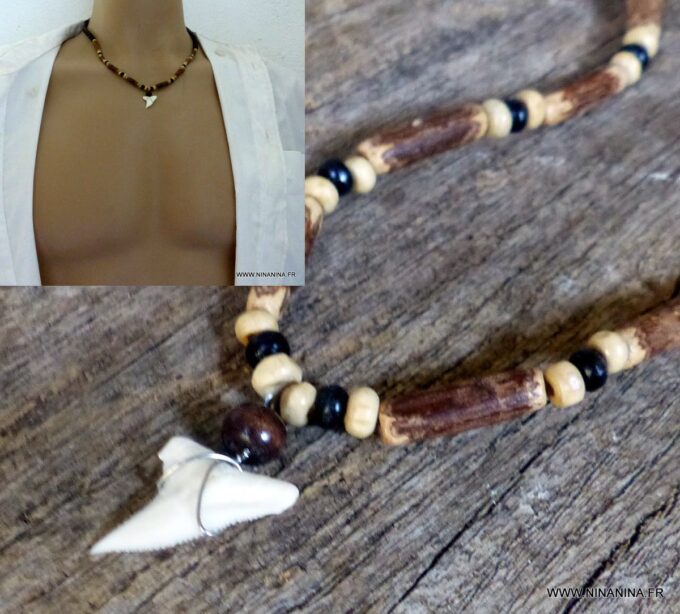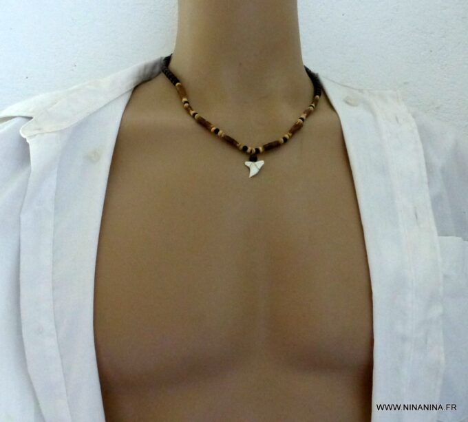 Entre crainte et fascination, entre bijou amulette et symbole de virilité, ce Collier ethnique pendentif Dent de requin perles bois constitué d’un pendentif dent de requin véritable monté sur un rang de perles de bois rondes et tube marron clair et foncé trouvera à qui parler!