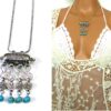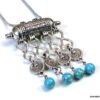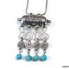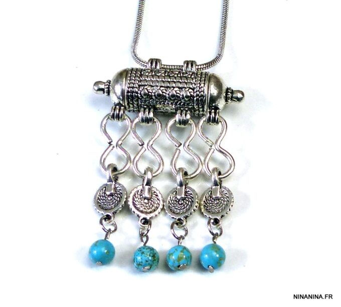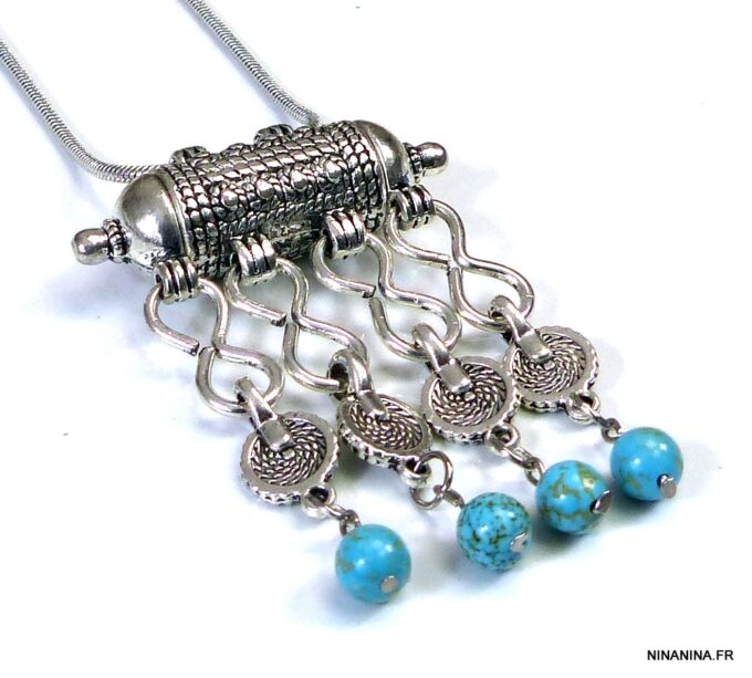 Collier mi-long métal argenté et turquoises composé de turquoises rondes et d’un pendentif en métal argenté vieilli montés sur une chainette serpent en métal argenté. Dim du pendant : 6 X 4 cm. Longueur totale (fermoir compris) : 45 cm env. Fermoir mousqueton et chainette de rallongement. Livré dans sa pochette d’organza. Bijou 100% fait-main