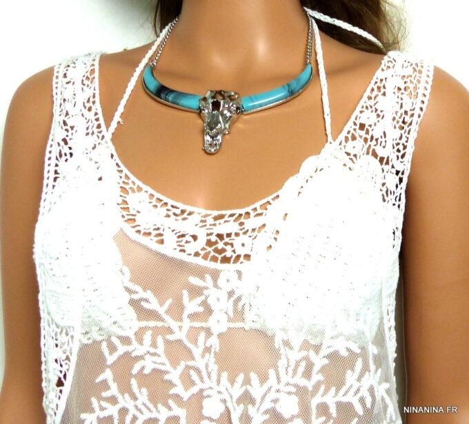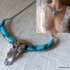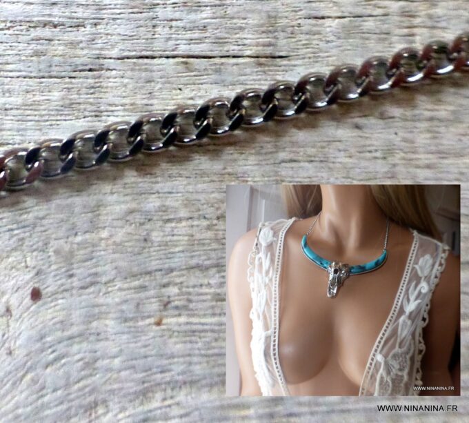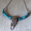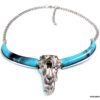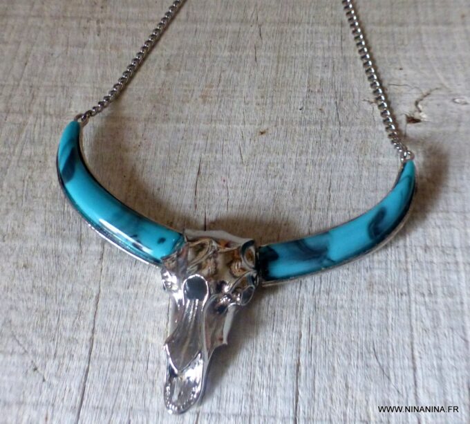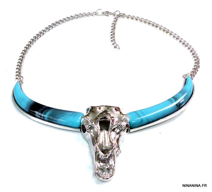Découvrez le Collier Fantaisie ethnique crane de buffle turquoise composé d’un pendentif crâne de buffle en métal argenté et résine turquoise monté sur une solide chaine maille gourmette en acier inoxydable argenté.