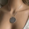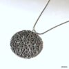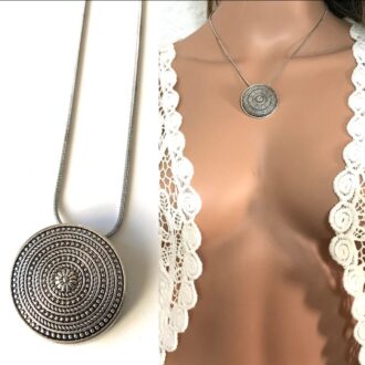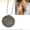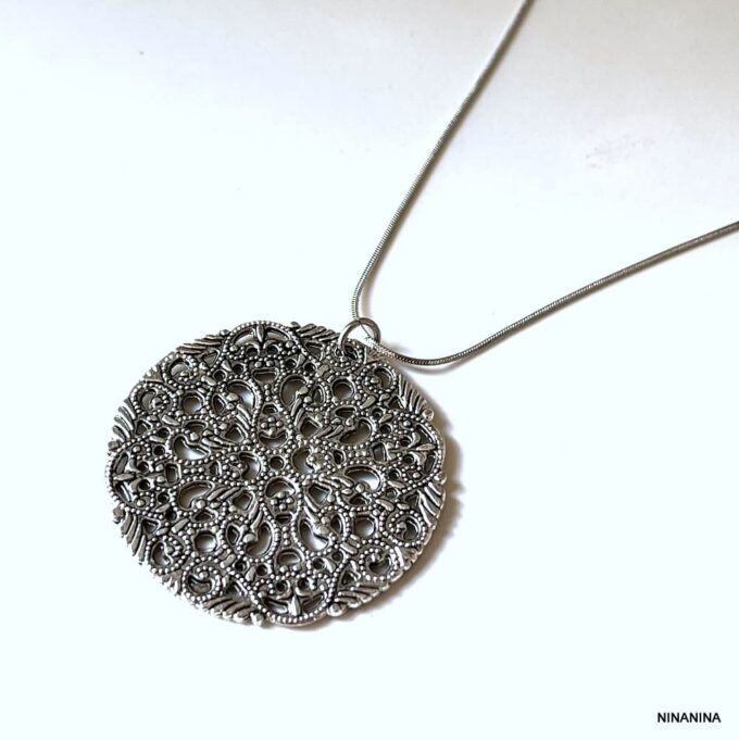 Découvrez notre Collier Fantaisie pendentif rond effet dentelle chaine serpent acier. Ce collier fantaisie pour femme met en valeur un grand pendentif rond au motif travaillé, finement texturé et ajouré comme une dentelle ancienne. Son design délicat évoque à la fois l’art oriental et l’élégance des bijoux vintage, tout en restant très actuel.