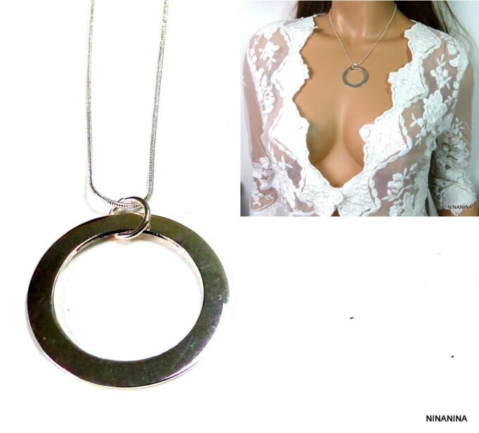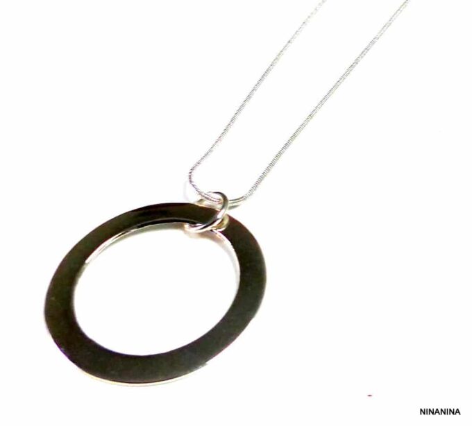 Collier femme anneau plaqué argent constitué d’un anneau rond en plaqué argent monté sur chainette serpent en plaqué argent.