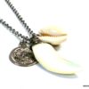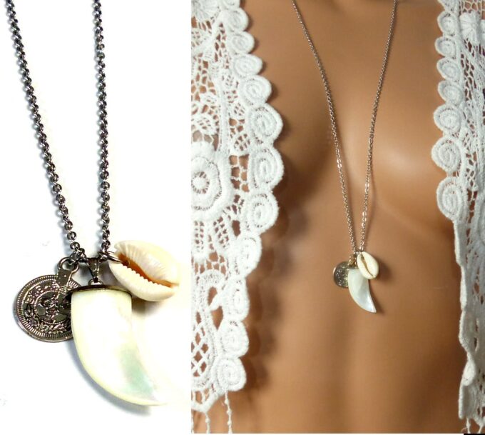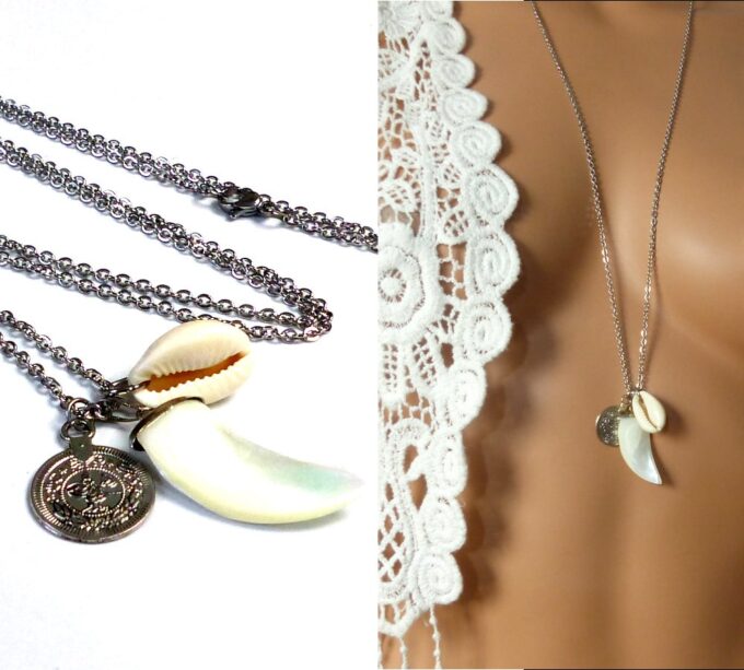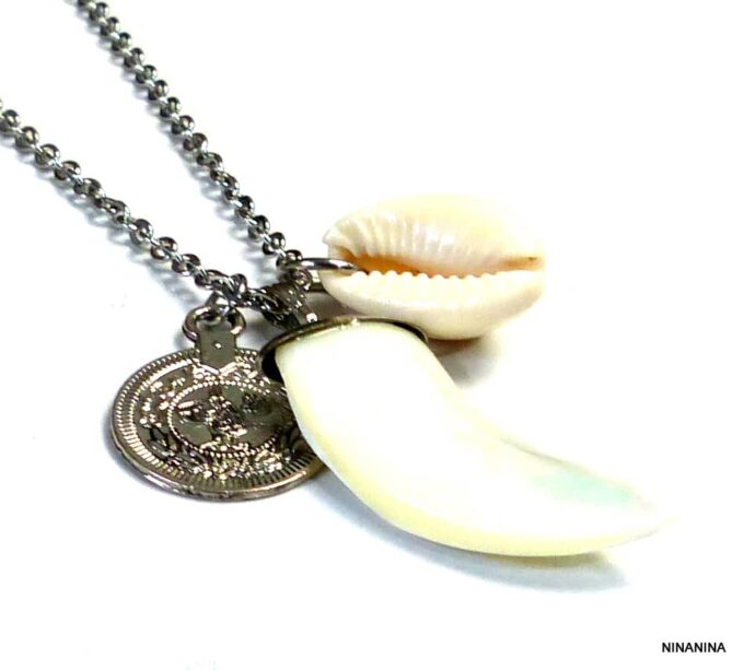 Collier long coquillage pièce et dent de requin composée d’un pendentif dent de requin en nacre blanche, d’un coquillage cauri et d’une pièce en métal argenté montées sur une chainette en acier inoxydable.