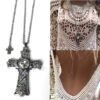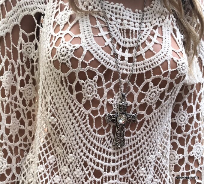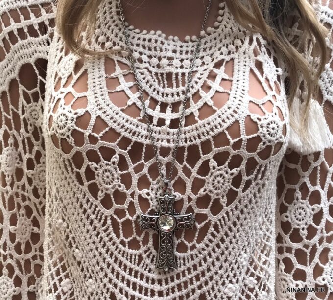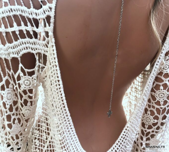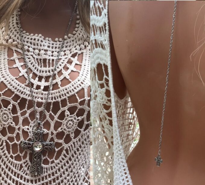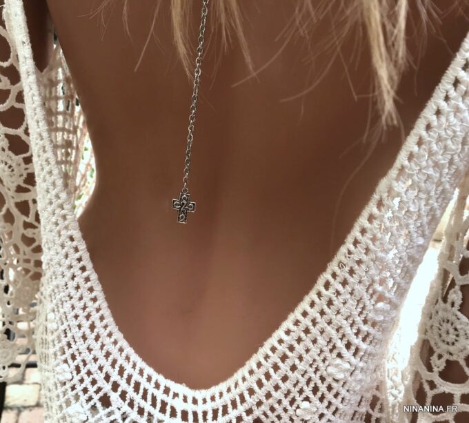 Collier pendentif croix femme – Sautoir et chaine dos composé de deux pendentifs croix en métal argenté montées sur chainette en acier inoxydable.