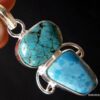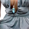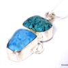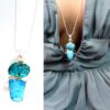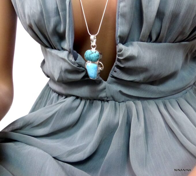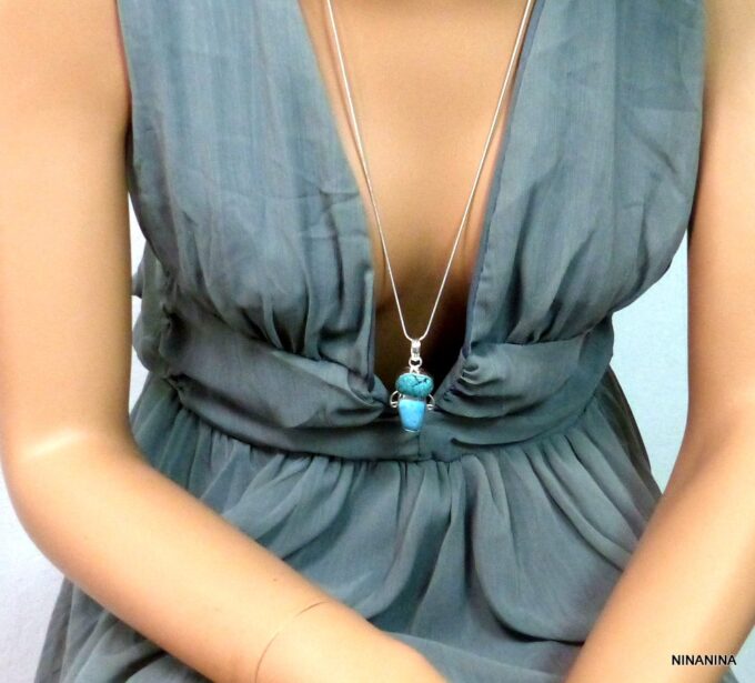 Collier femme long pendentif en turquoise naturelle serti plaqué argent composé de deux cabochons en turquoise naturelle sertis montés sur chainette en plaqué argent.