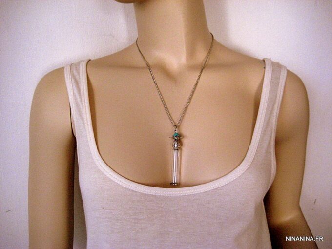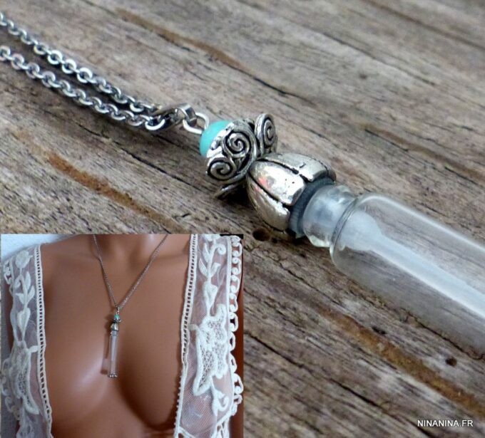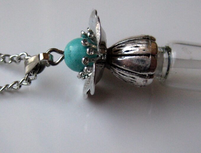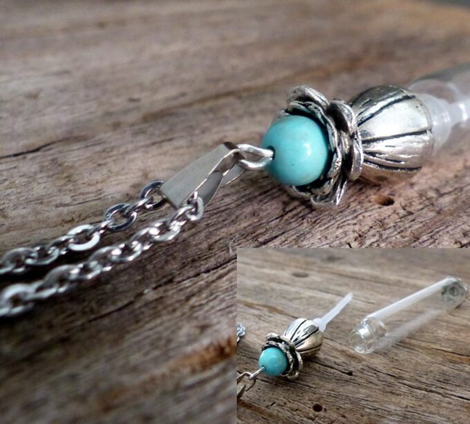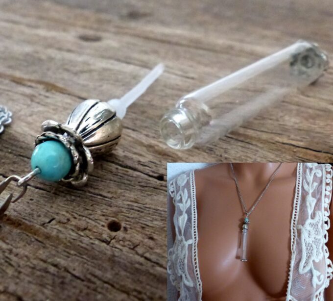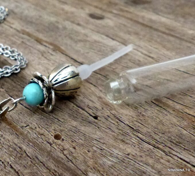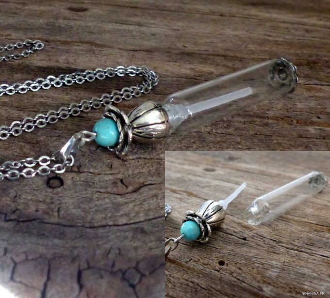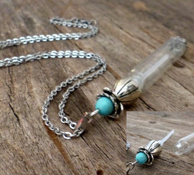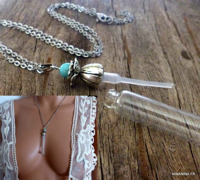 Collier parfum femme fiole de parfum verre turquoise composé d’une petite fiole de verre pouvant contenir du parfum monté sur fine chainette en acier inoxydable.