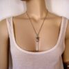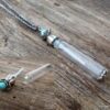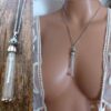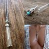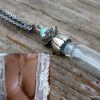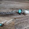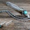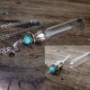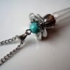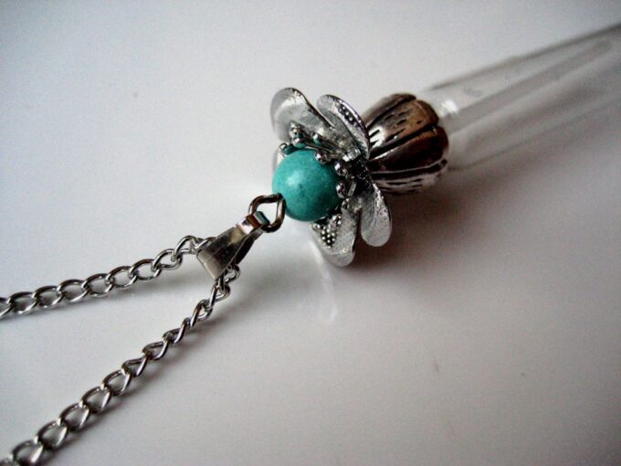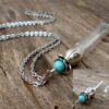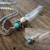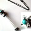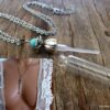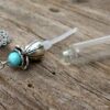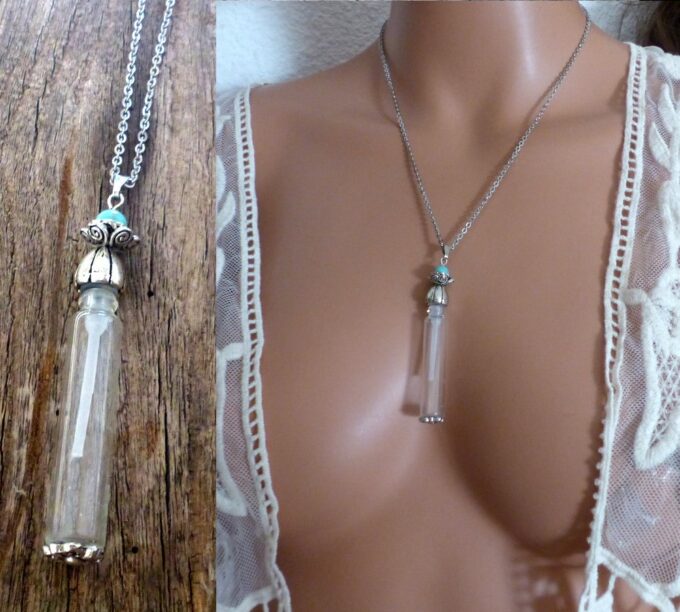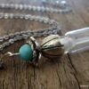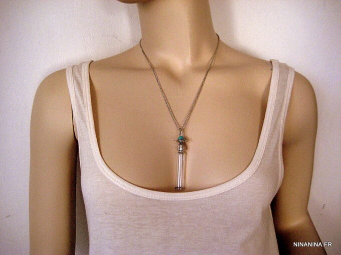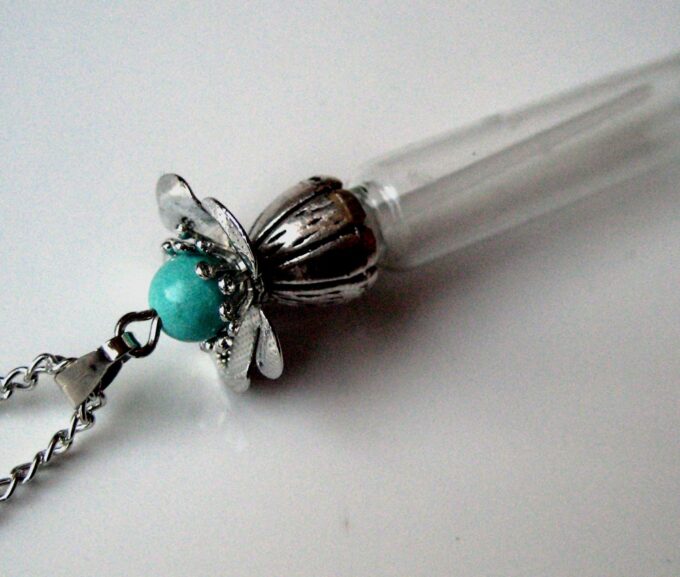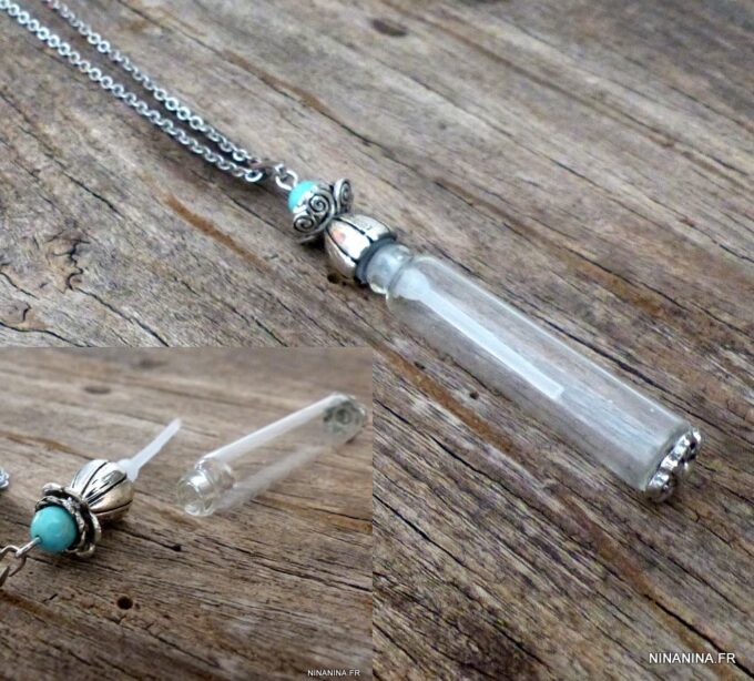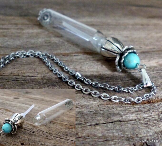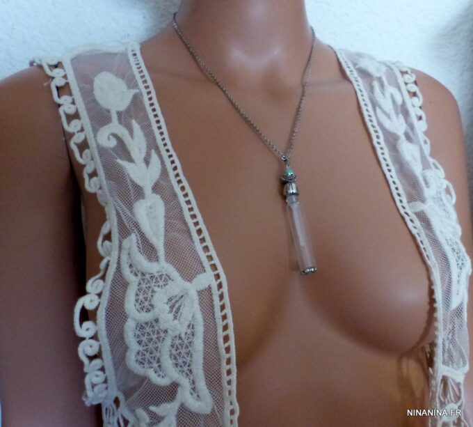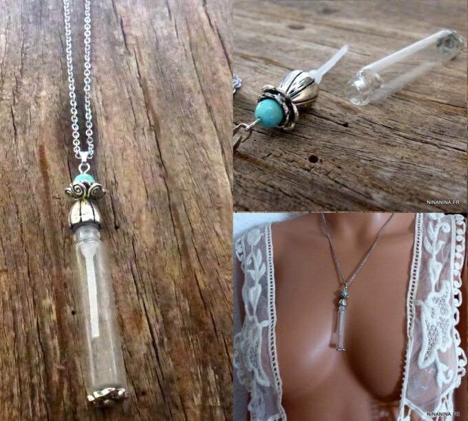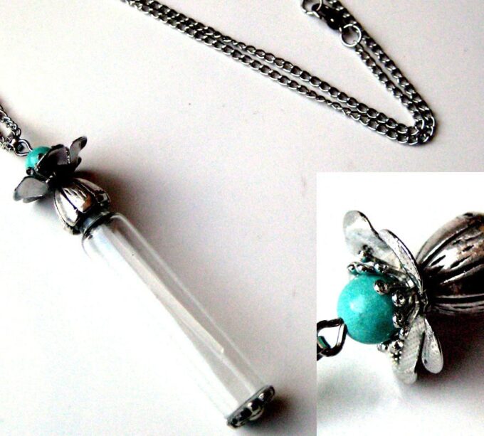 Collier parfum femme fiole de parfum verre turquoise composé d’une petite fiole de verre pouvant contenir du parfum monté sur fine chainette en acier inoxydable.