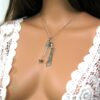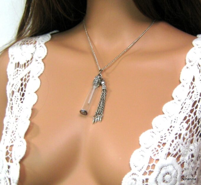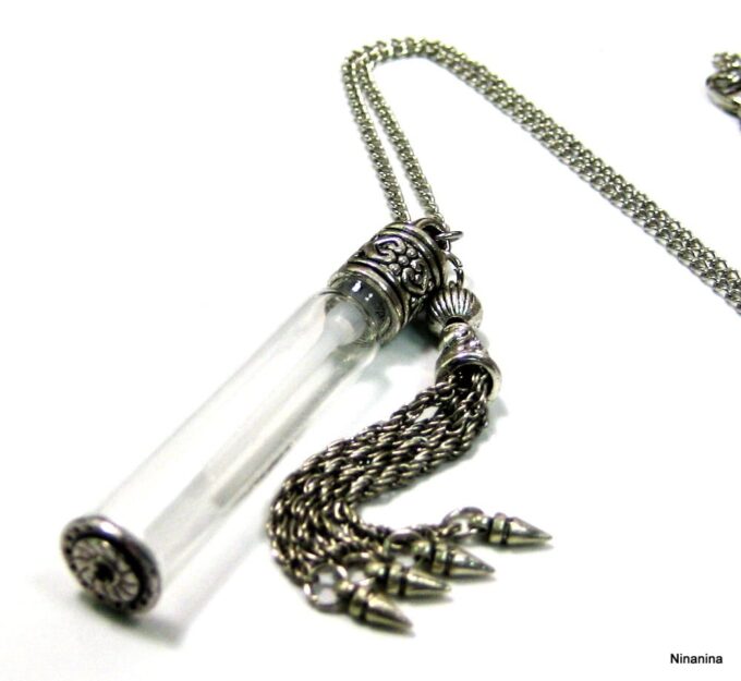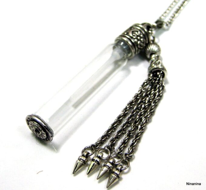Découvrez Collier parfumeur fiole en verre et pompon argent composé d’une petite fiole de verre pouvant contenir du parfum monté sur fine chainette en acier inoxydable.