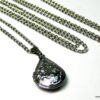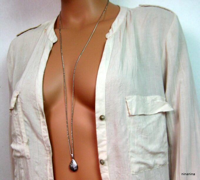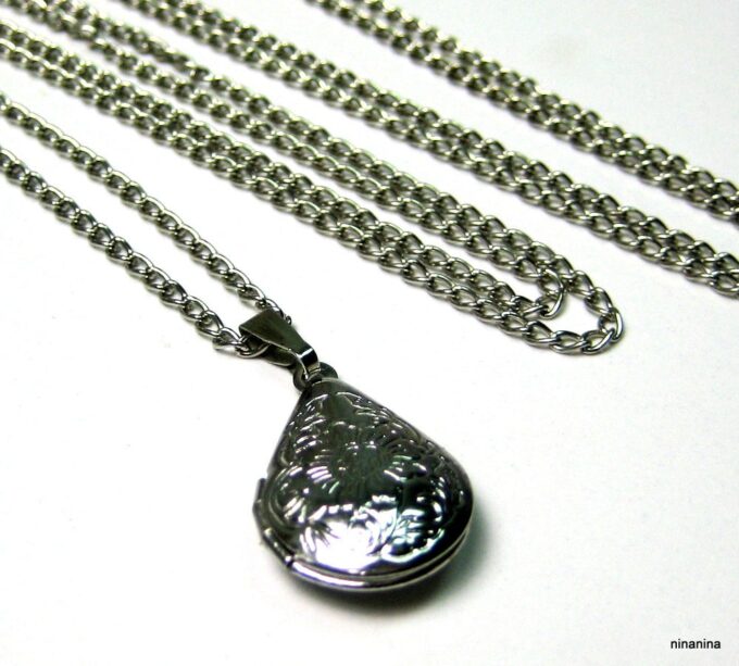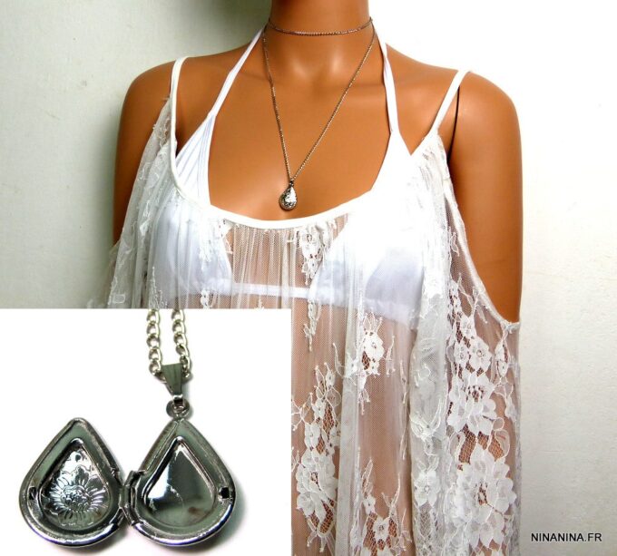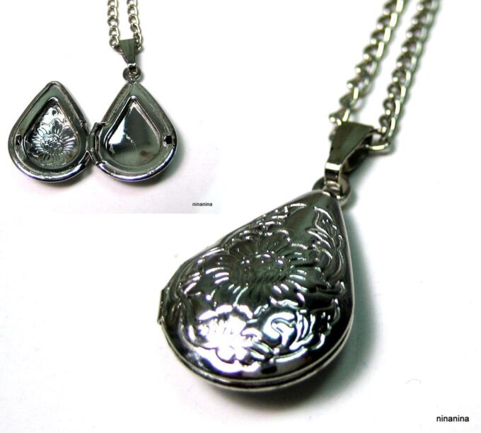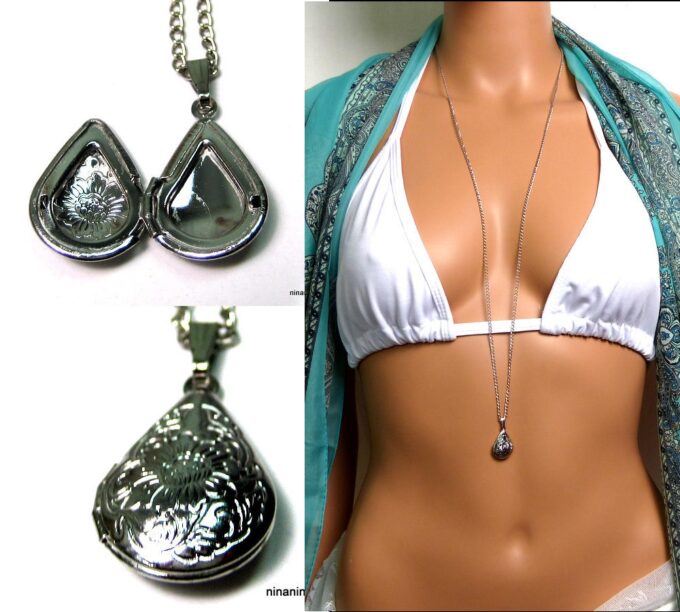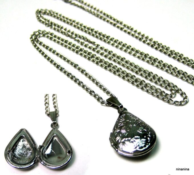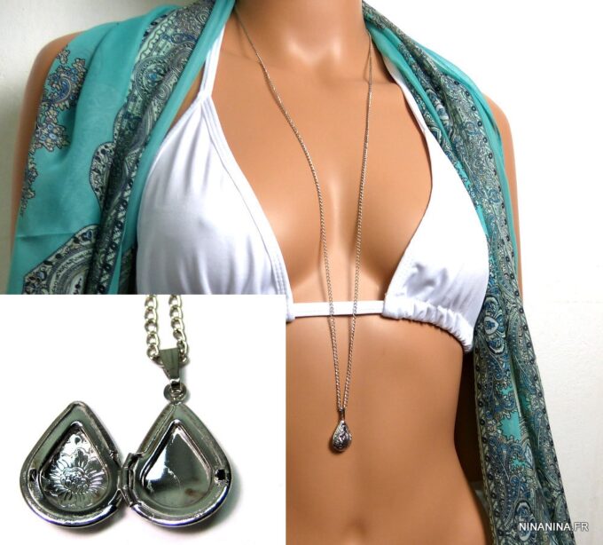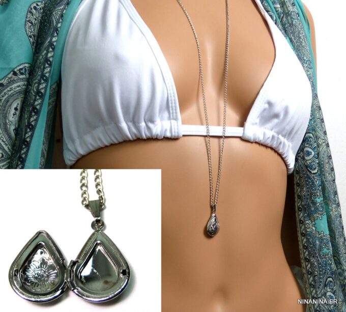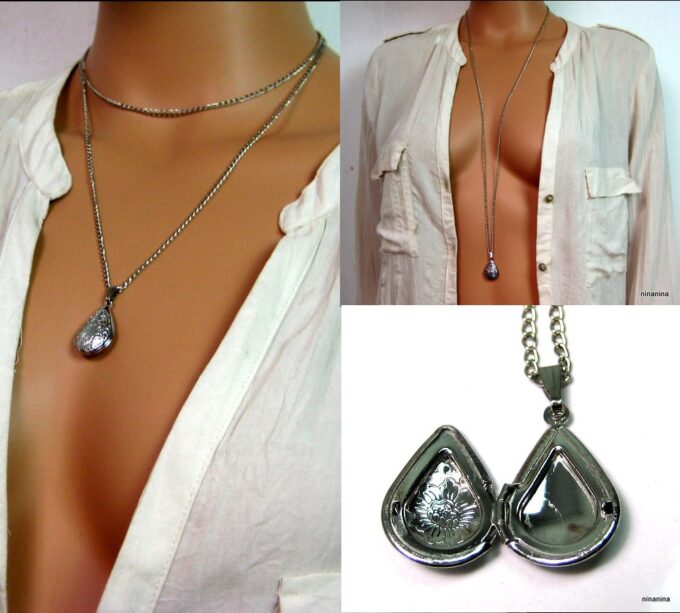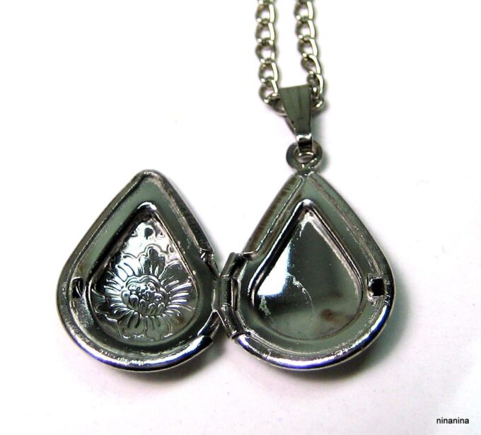 Collier goutte porte-photo métal argenté composé d’un pendentif goutte porte-photo en métal argenté monté sur chainette en métal argenté. Dim du pendentif : 2,5 X 1,5 cm. Longueur : 90 cm environ. Peut se porter long ou court (2 tours). Fermoir mousqueton. Livré dans sa pochette d’organza. Bijou 100% fait-main