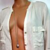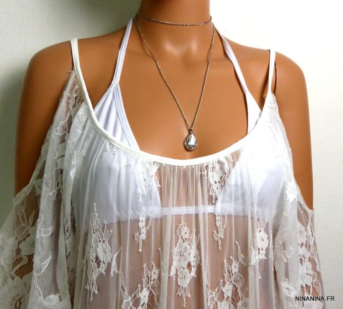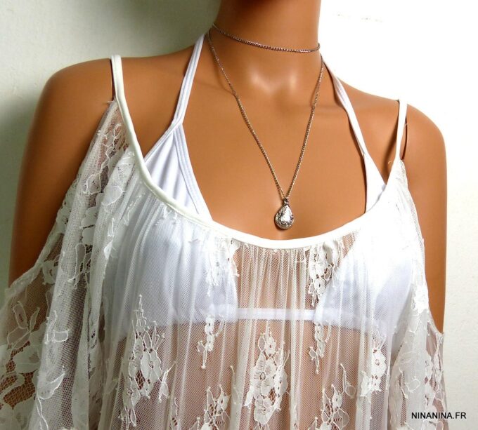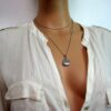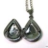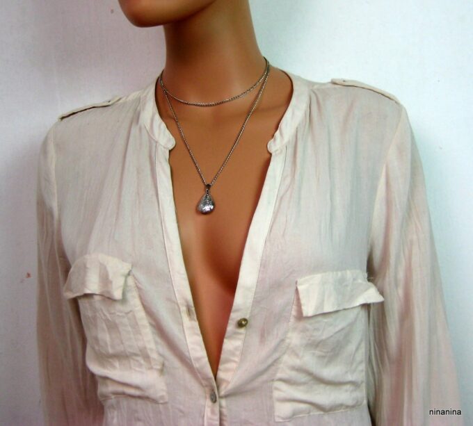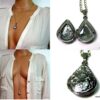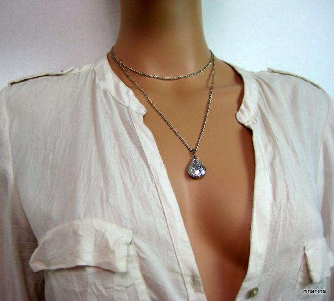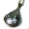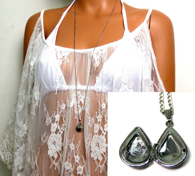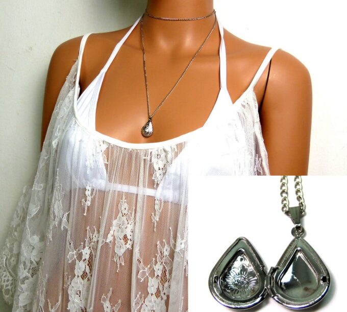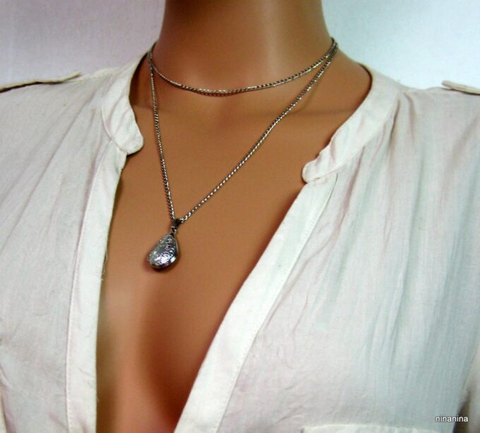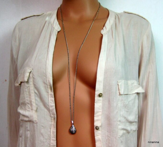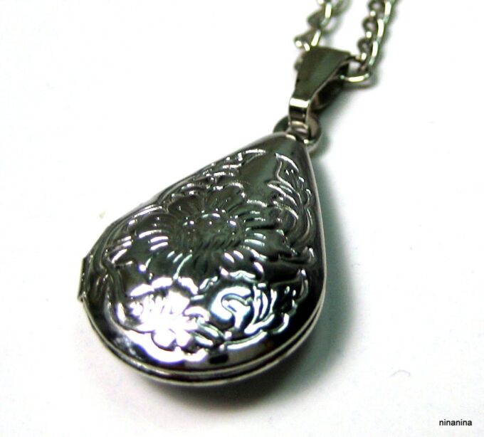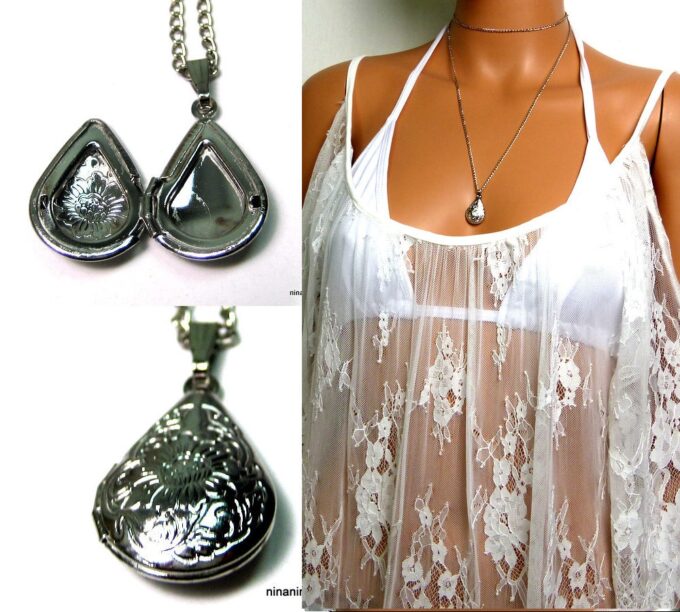 Collier goutte porte-photo métal argenté composé d’un pendentif goutte porte-photo en métal argenté monté sur chainette en métal argenté. Dim du pendentif : 2,5 X 1,5 cm. Longueur : 90 cm environ. Peut se porter long ou court (2 tours). Fermoir mousqueton. Livré dans sa pochette d’organza. Bijou 100% fait-main