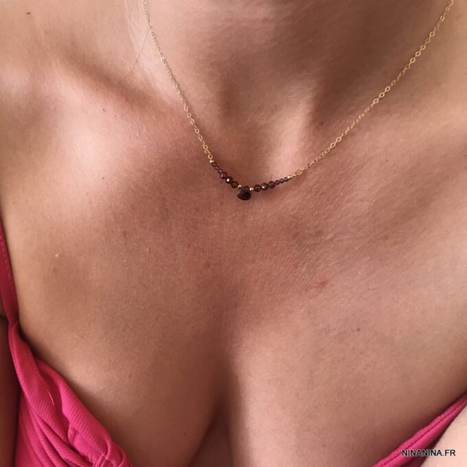 Ce collier avec ses petits grenats est plaqué or 14 carats gold filled. Le Gold filled est une finition en Or 14 carat appliquée sur une base en laiton dont le poids d’or correspond à 1/20 du poids total du produit. Alternative à l’or, le Gold Filled 14 carats permet de réaliser des bijoux ultra tendance avec un rendu similaire à celui des bijoux en or. Trés résistant, il peut durer toute une vie dans des conditions normales d’utilisation.
