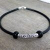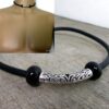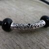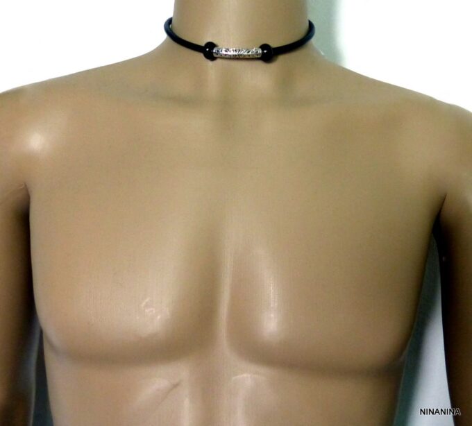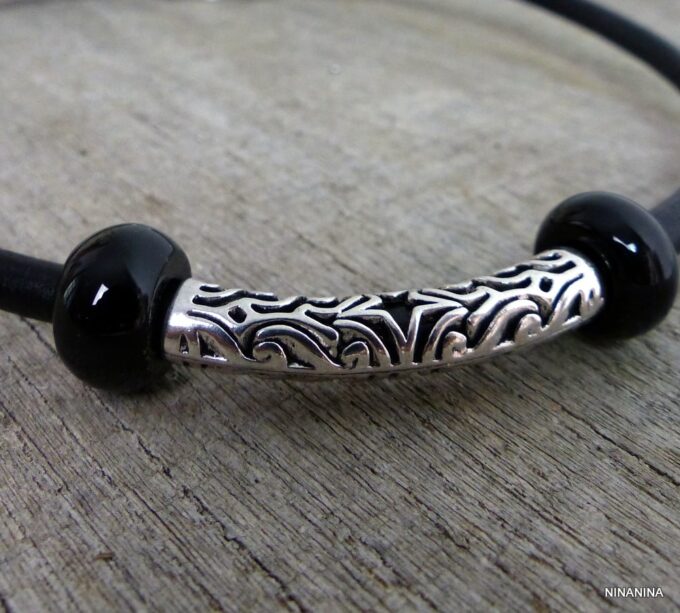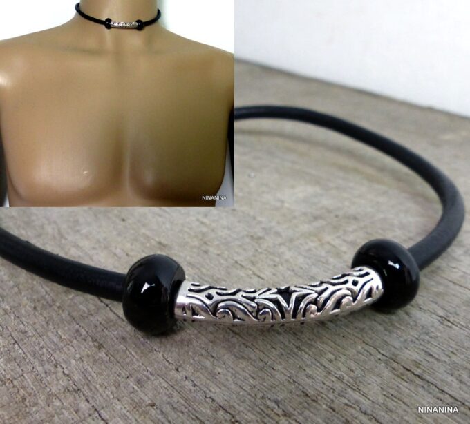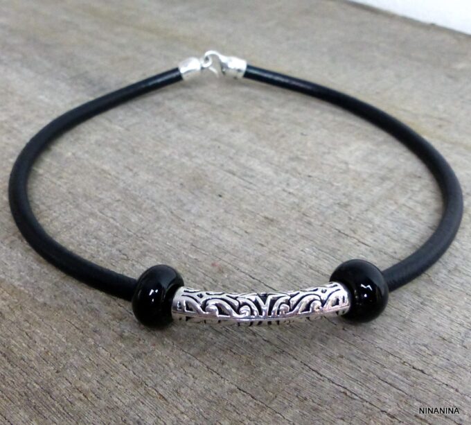Collier homme cordon cuir composé d’une perle tube cylindrique en métal argenté et deux rondelles en agate noire montés sur un cordon de cuir noir (5mm de diamètre). Dim de la perle : 5 X 0,5 cm. Fermoir en S. Longueur totale (fermoir compris): 40 cm env – TOUTE AUTRE LONGUER POSSIBLE à indiquer en commentaire. Livré dans sa pochette d’organza. Bijou 100% fait main.