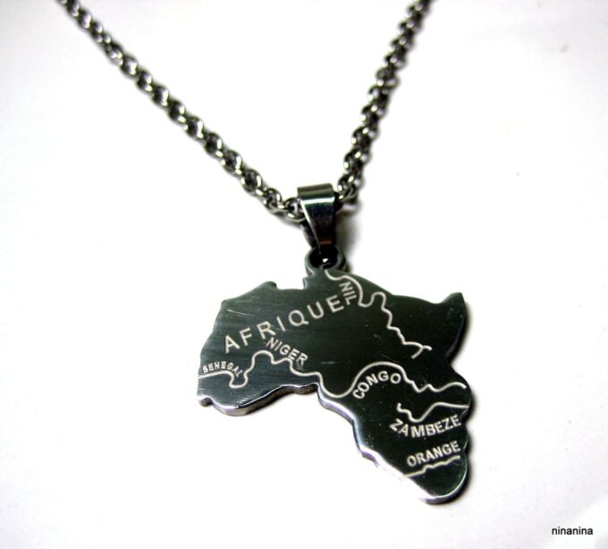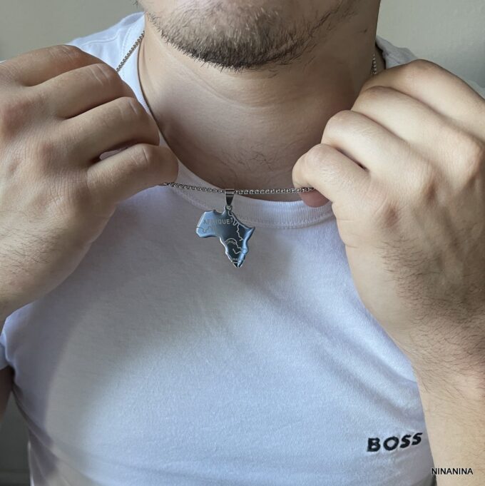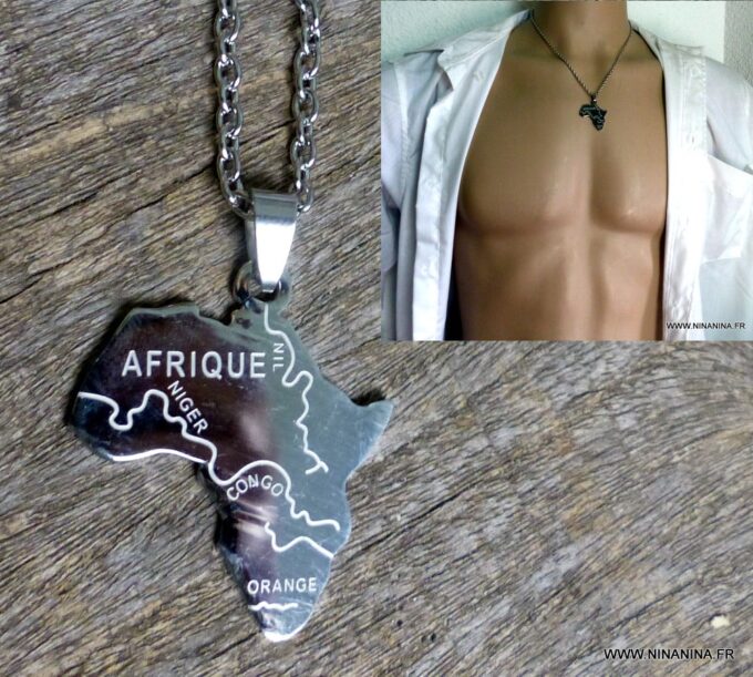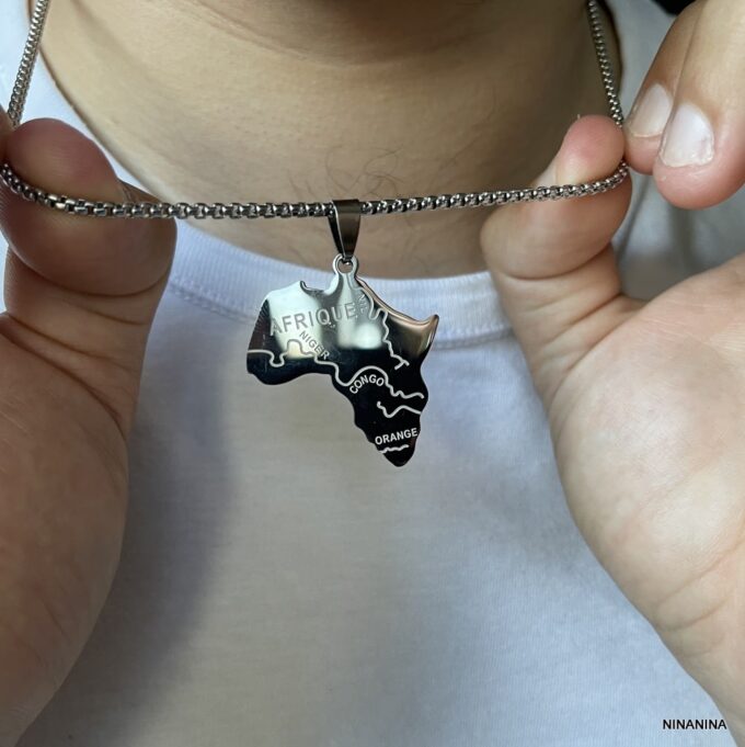 Découvrez ce Collier Afrique Homme – Pendentif Acier Inoxydable composé d’un pendentif Afrique d’une qualité remarquable qui fait apparaitre les pays et les principaux fleuves africains de manière extrêmement précise, est monté sur une chaine maille forçat en acier inoxydable et terminé par un fermoir mousqueton, sûr et facile d’utilisation.