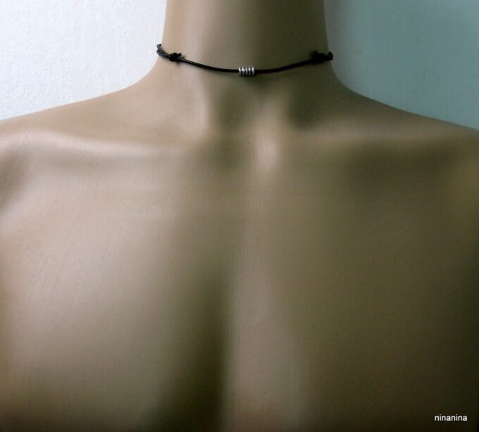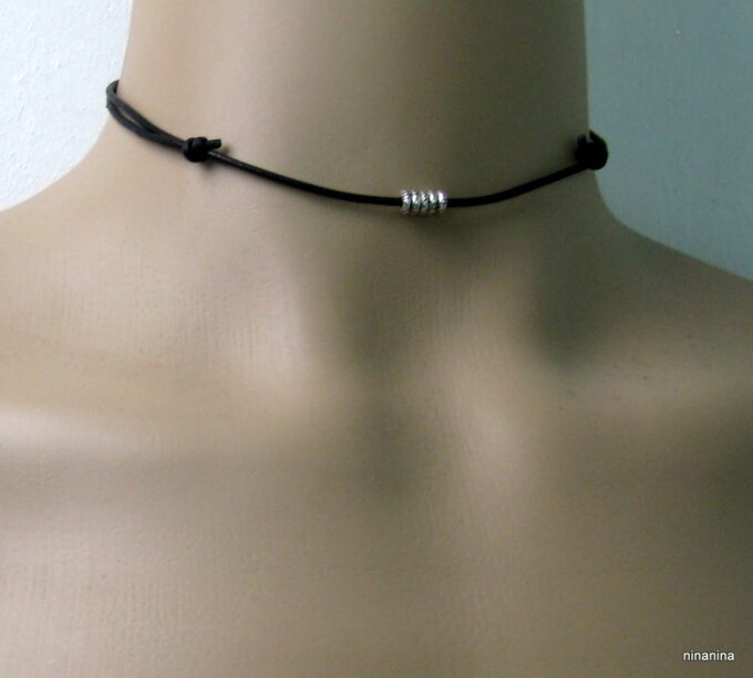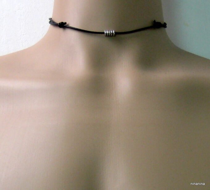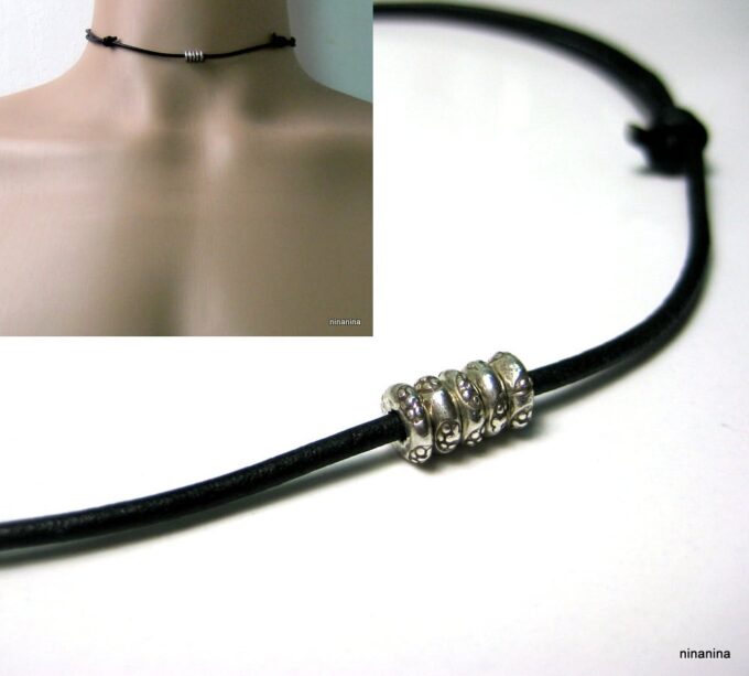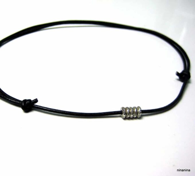 Tour de cou cuir rondelles argent – Collier Cordon noir