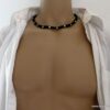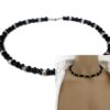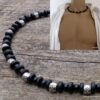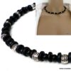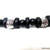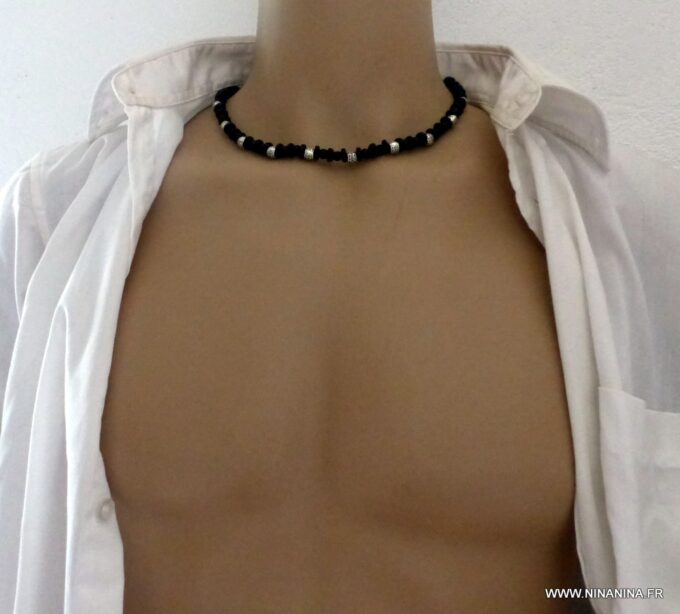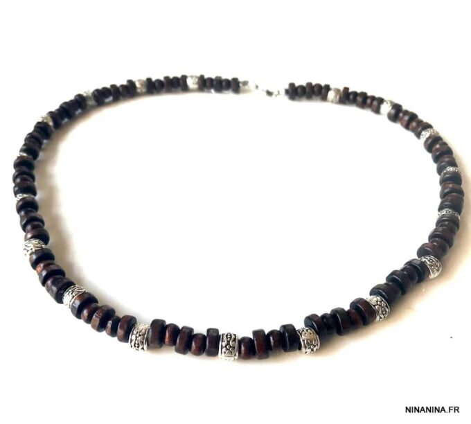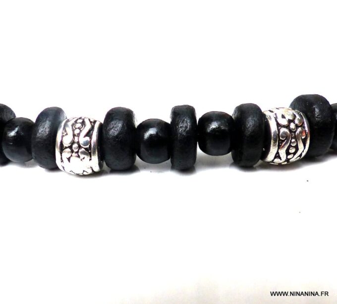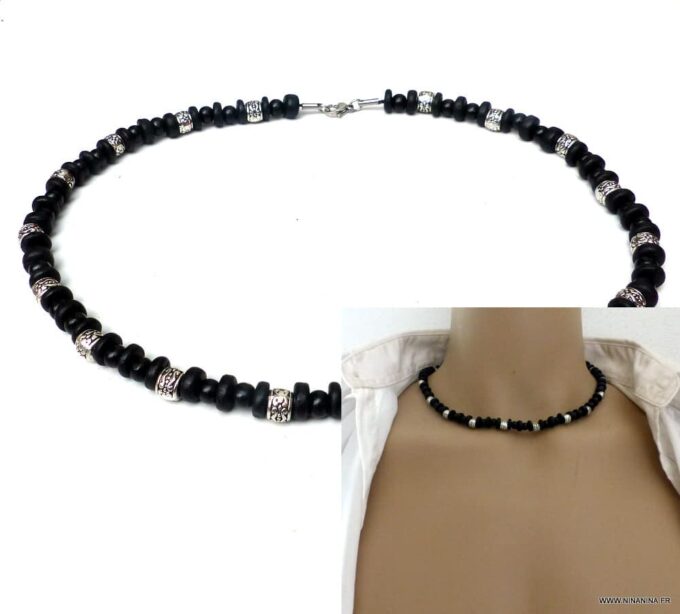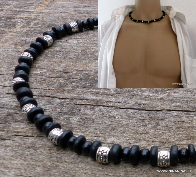 Collier homme perles bois noir rondelles métal argenté composé de rondelles en métal argent, de perles et de rondelles de bois noir montées sur un cordon de coton ou elastique .