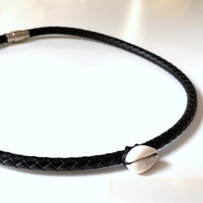Ce Collier homme coquillage cauri ras de cou cuir tressé est un bijou artisanal conçu pour les hommes recherchant une pièce élégante, naturelle et symbolique. Fait main dans notre atelier du sud de la France, il allie sobriété et originalité grâce à la combinaison d’un cordon en cuir tressé noir et d’un coquillage cauri blanc, créant un contraste harmonieux et moderne.