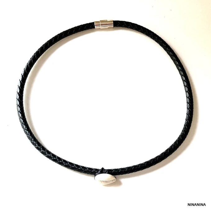 Ce Collier en Cuir est une pièce originale qui puise son inspiration dans les tendances ethniques et bohèmes. Le coquillage cauri blanc symbolise la prospérité et la connexion avec la nature, tandis que le cuir tressé noir apporte une touche robuste et masculine.
