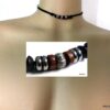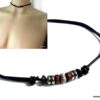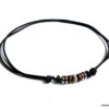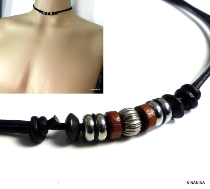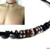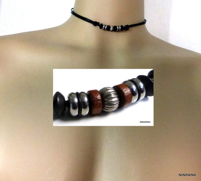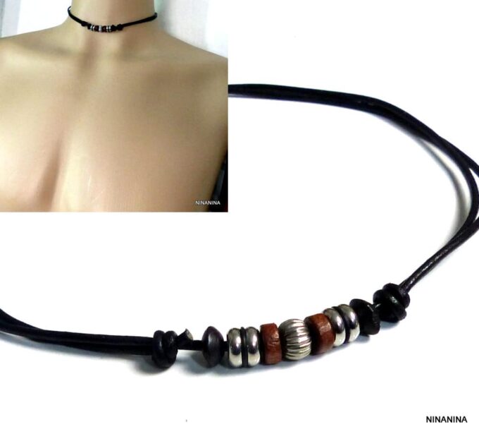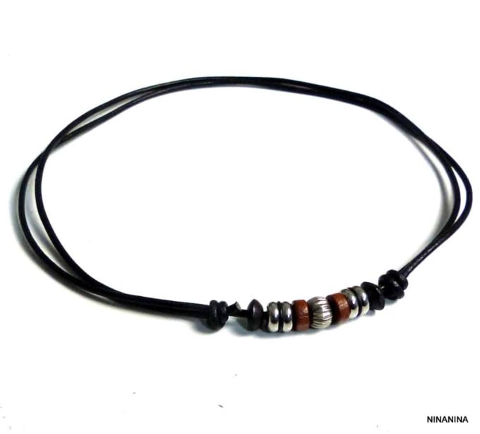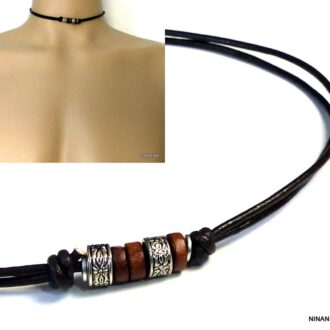Collier homme cordon cuir rondelles bois et acier inoxydable composé de rondelles de bois marron et noires et acier inoxydable montées sur un double cordon de cuir noir (2 mm de diamètre).