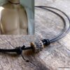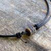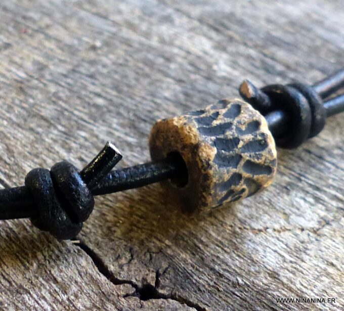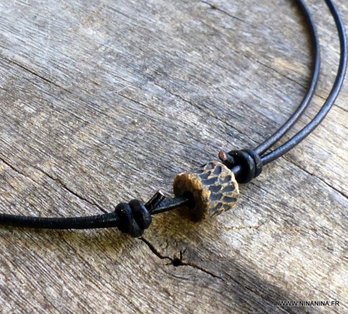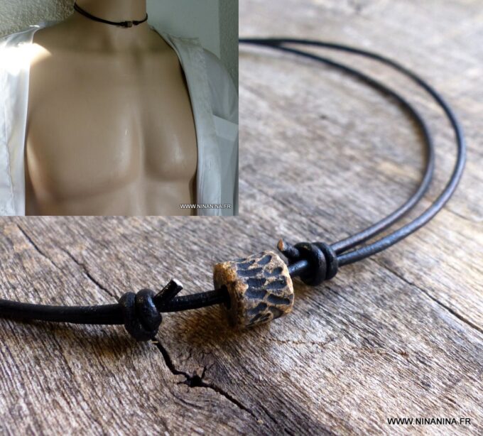 Collier cordon cuir pour homme perle marron sculptée composé d’une perle cylindrique en céramique marron sculptée montée sur un cordon de cuir noir (2mm de diamètre).
