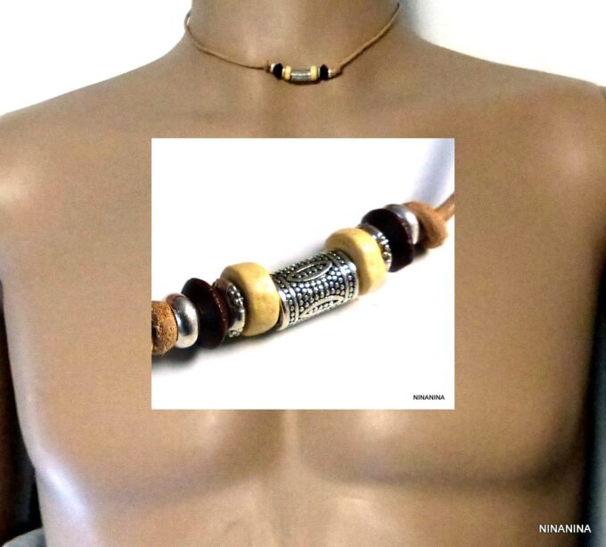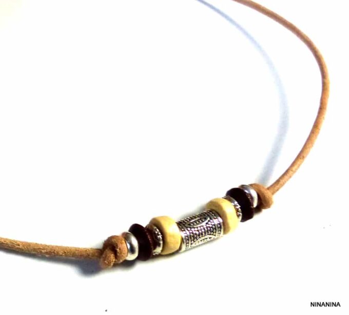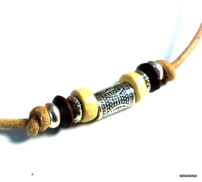 Collier cordon cuir Perle tube et rondelles Argent 925 massif composé d’une perle tube et de rondelles en argent 925 et en bois montées sur un cordon de cuir noir (2 mm de diamètre).