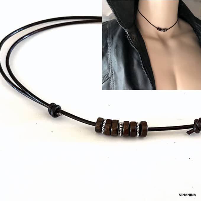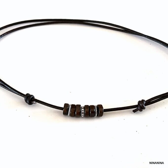 Craquez pour la sobriété de ce Collier cordon cuir rondelles bois marron et Argent 925 composé de rondelles de bois et argent 925 montées sur un cordon de cuir noir ajustable !