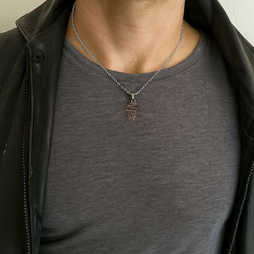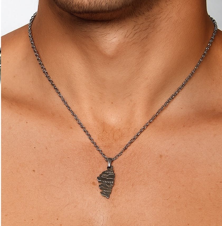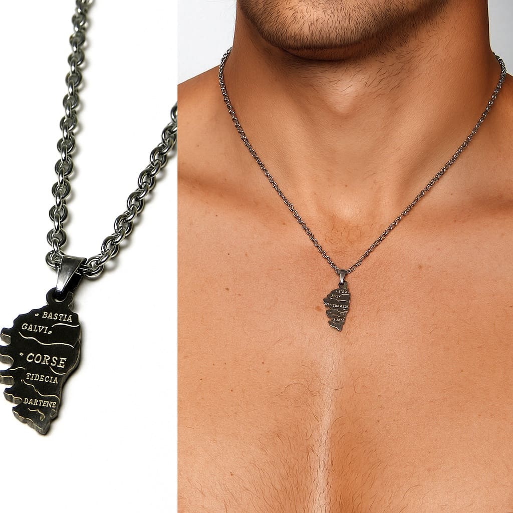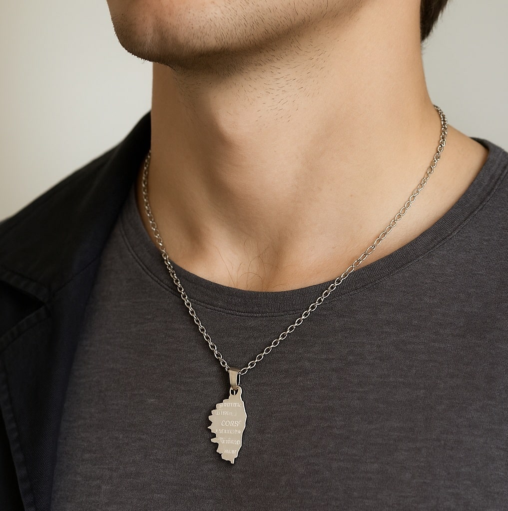 Ce collier Corse pour homme est orné d’un pendentif représentant la carte de l’île de beauté, finement gravée pour rappeler ses reliefs et sa force.