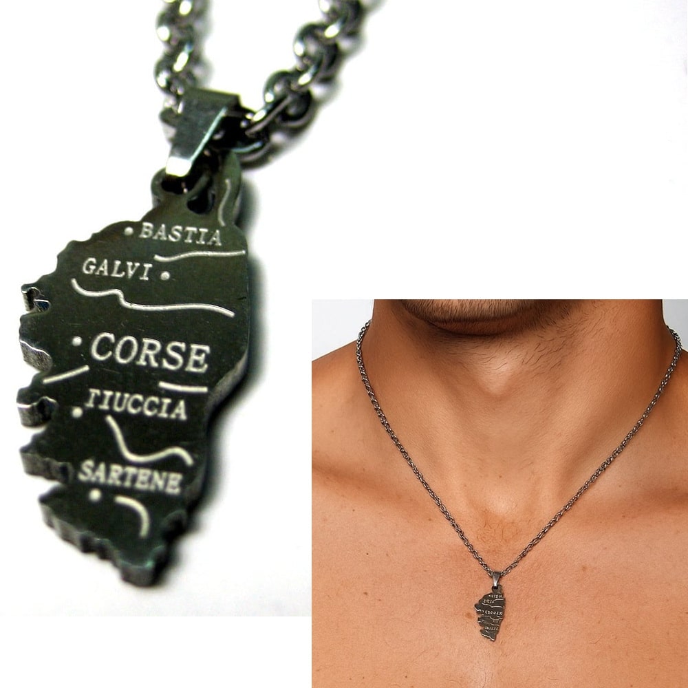Soyez fier de vos origines et portez-les près de votre coeur avec ce Collier Corse Homme Acier inoxydable argenté qui vous mettra du baume au coeur! Un collier porte bonheur composé d’un pendentif Corse d’une qualité remarquable qui fait apparaitre les villes et les principaux fleuves de l’ile de beauté de manière extrêmement précise, monté sur une chaine maille forçat en acier chirurgical argenté.
