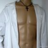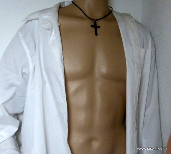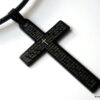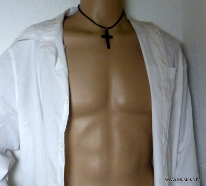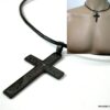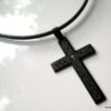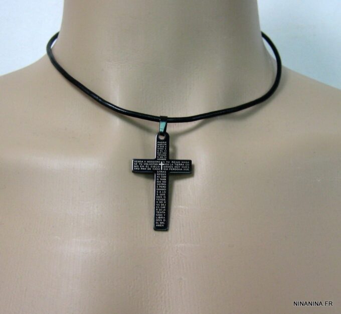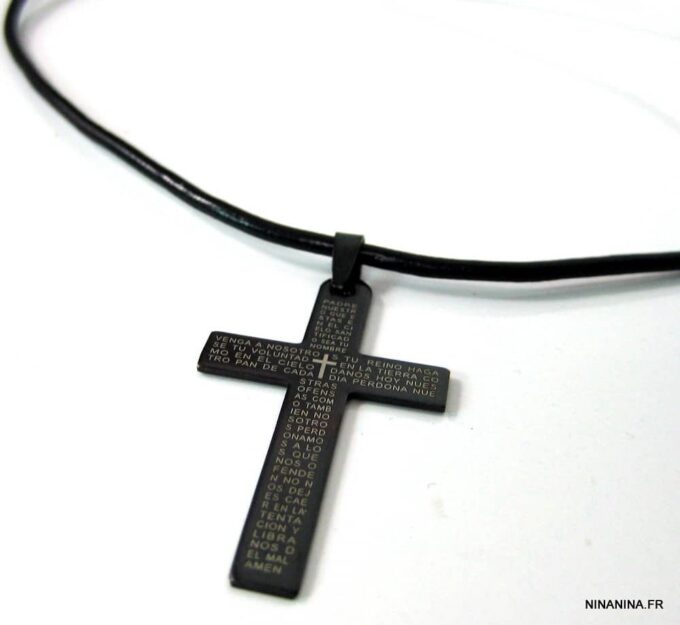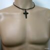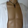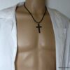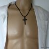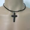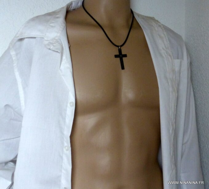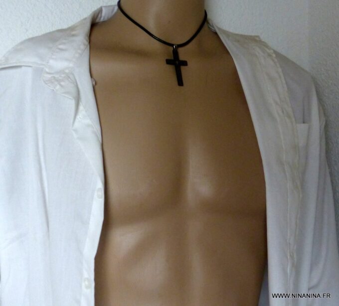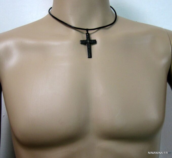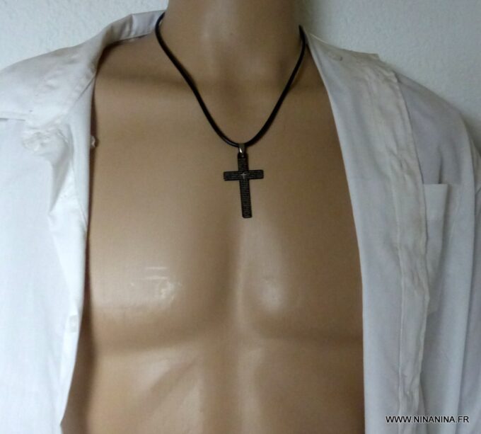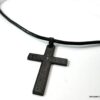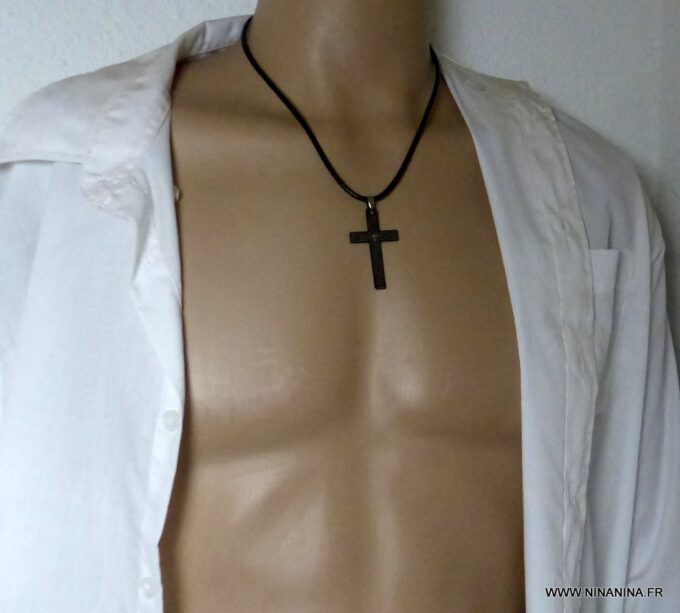 Collier homme pendentif croix Acier noire cordon cuir composé d’une croix en acier inoxydable noir montée sur un lien de cuir noir (3mm de diamètre).