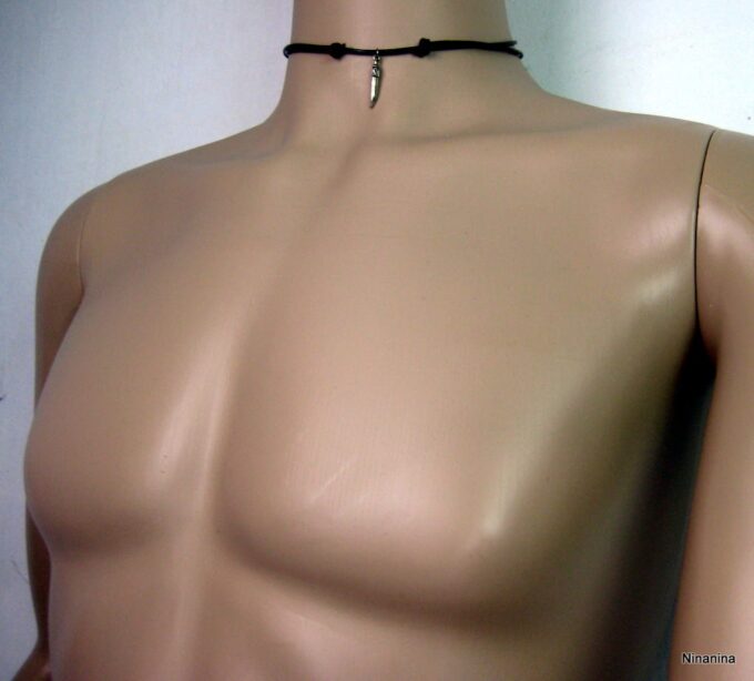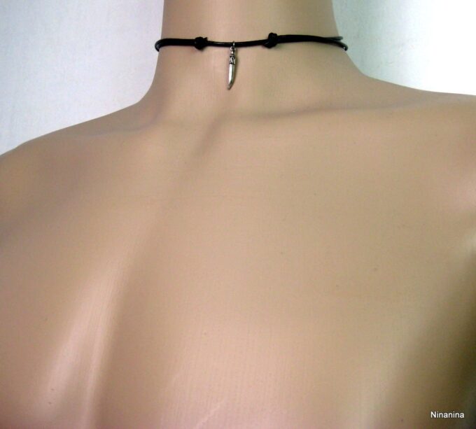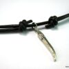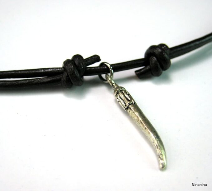 Collier cordon cuir composé d’un pendentif dent de tigre en métal argenté monté sur un cordon de cuir noir (2 mm de diamètre). Dim du pendentif : 2,6 X 0,4 cm env. Existe avec un cordon noir, marron chocolat, gris, turquoise, rose foncé et naturel. Fermeture par liens coulissants. Longueur : de 17 à 30 cm env réglable. Livré dans sa pochette d’organza. Bijou 100% fait main.