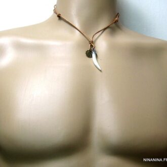 Collier dent de tigre nacre homme cordon cuir composé d’un pendentif dent de tigre en nacre blanche et métal argenté monté sur un cordon de cuir noir (2 mm de diamètre).