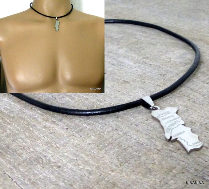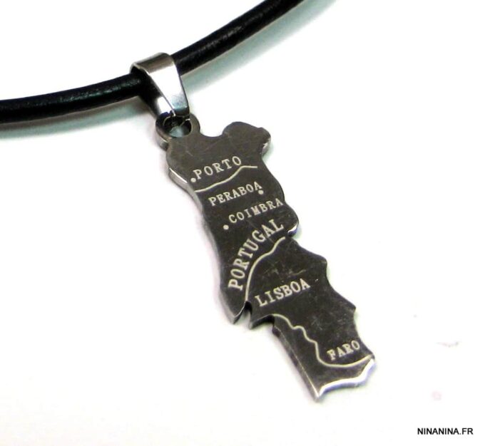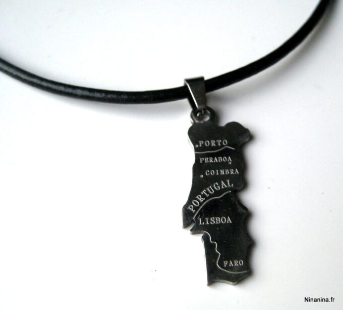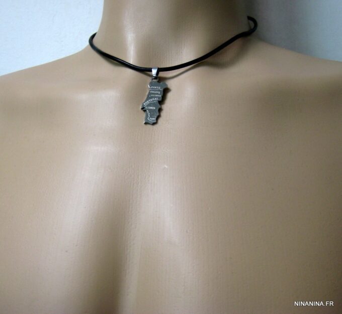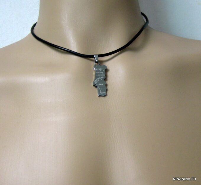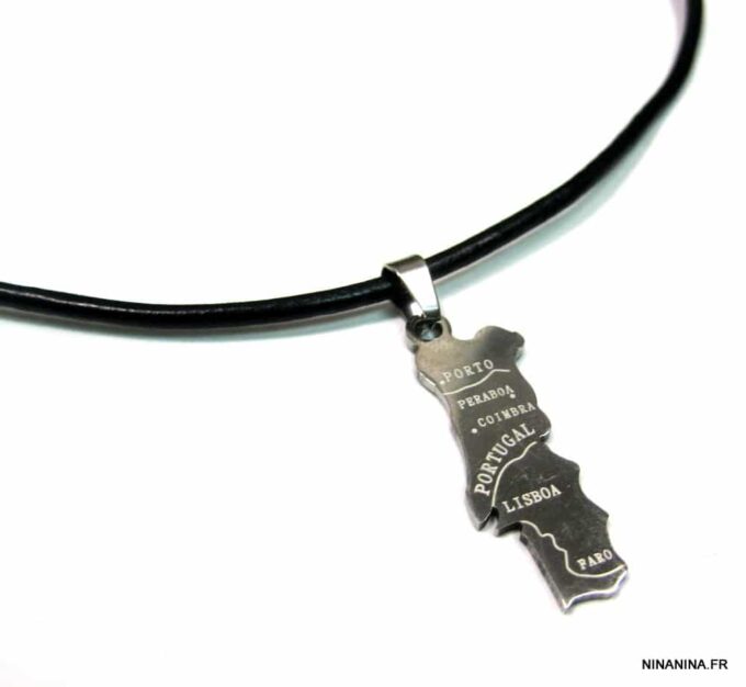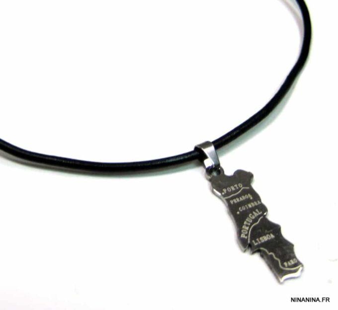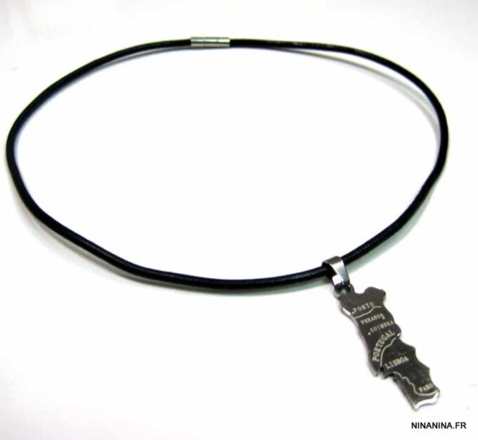 Collier homme cuir PORTUGAL acier argenté composé d’un pendentif PORTUGAL en acier inoxydable monté sur un lien de cuir véritable (3mm de diamètre).