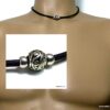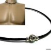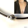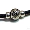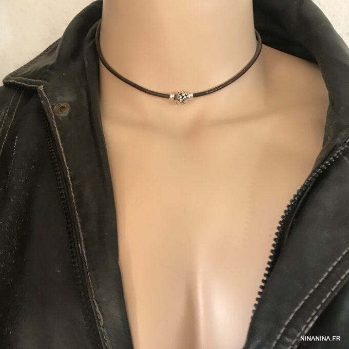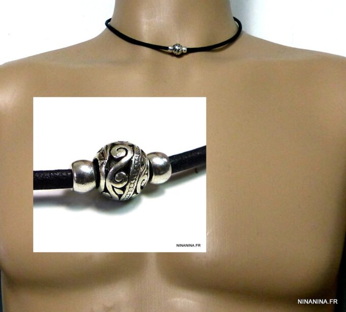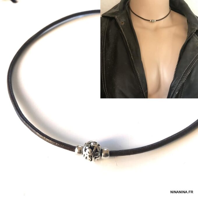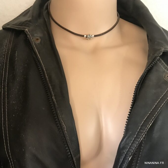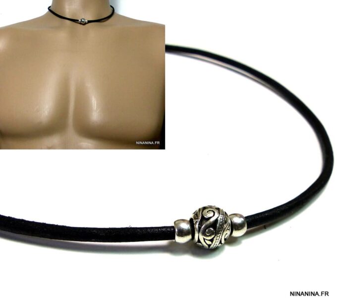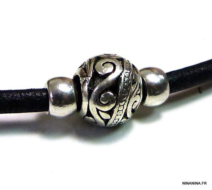 Ras de cou homme cordon cuir boule métal argenté composé d’une boule ciselée et de deux rondelles en métal argenté montées sur cordon de cuir (3mm de diamètre).