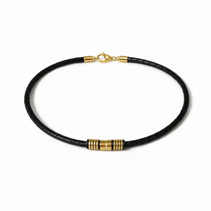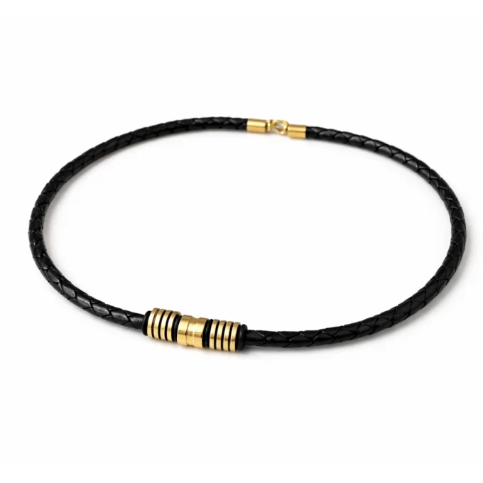 Ce ras de cou pour homme en cuir tressé séduit par son design sobre et élégant. Son cordon en cuir noir tressé met en valeur un ensemble de perles cylindriques en acier inoxydable doré, apportant une touche lumineuse et contemporaine.