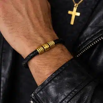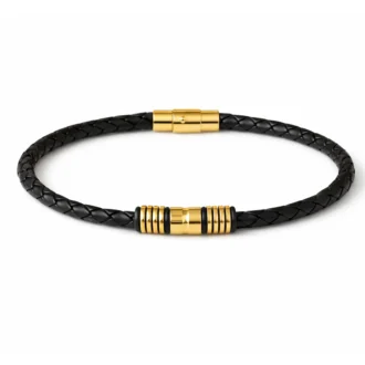 L’association du cuir tressé noir et de l’acier doré crée un contraste élégant et tendance. Les perles métalliques apportent une finition graphique et équilibrée qui renforce le caractère du bijou pour homme tout en restant facile à porter au quotidien.