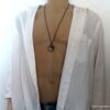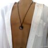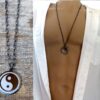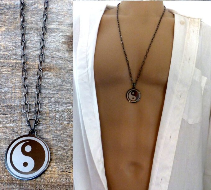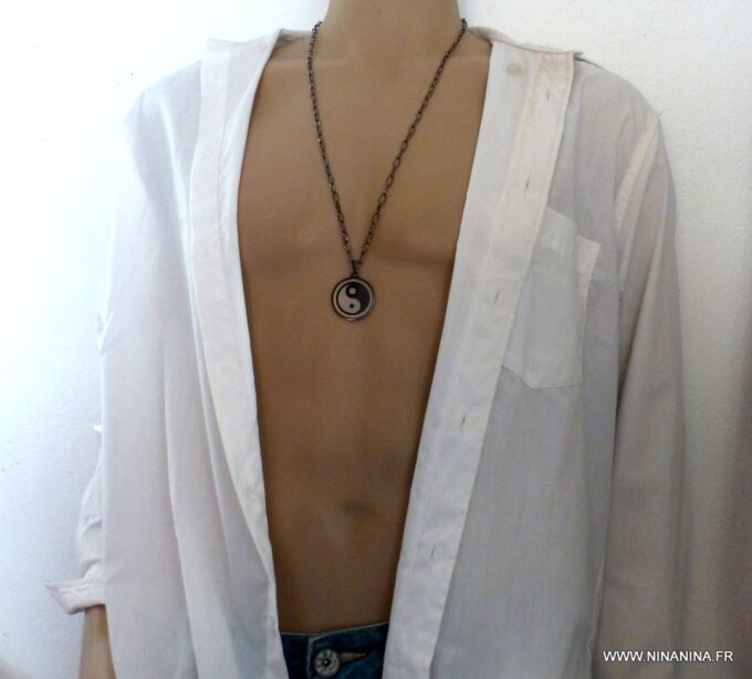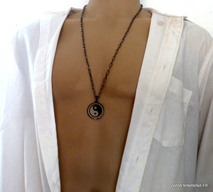 Collier homme long yin yang acier inoxydable composé d’un pendentif yin yang en acier inoxydable noir et argent monté sur une chaine maillons ovales en métal noir.
