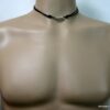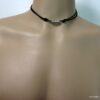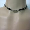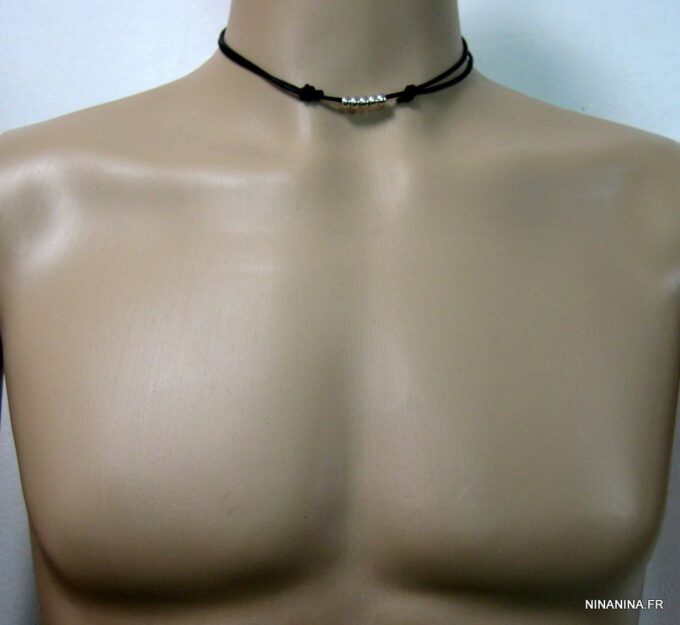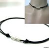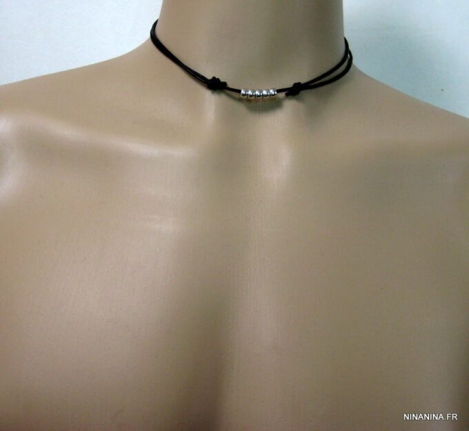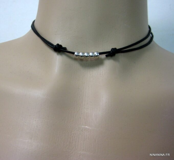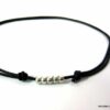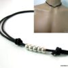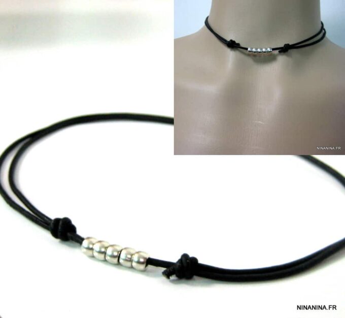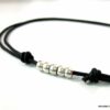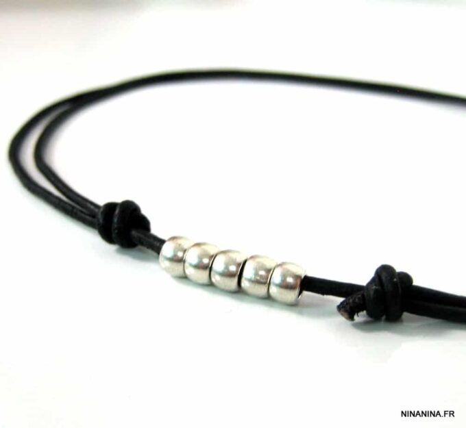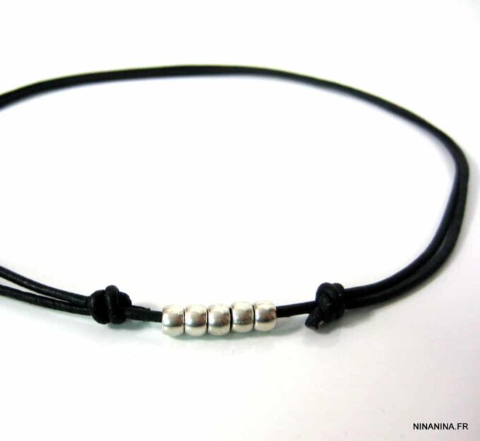Collier homme cordon noir cuir perles métal argenté composé de 5 perles cylindriques en métal argenté montées sur un double cordon de cuir noir (2 mm de diamètre).