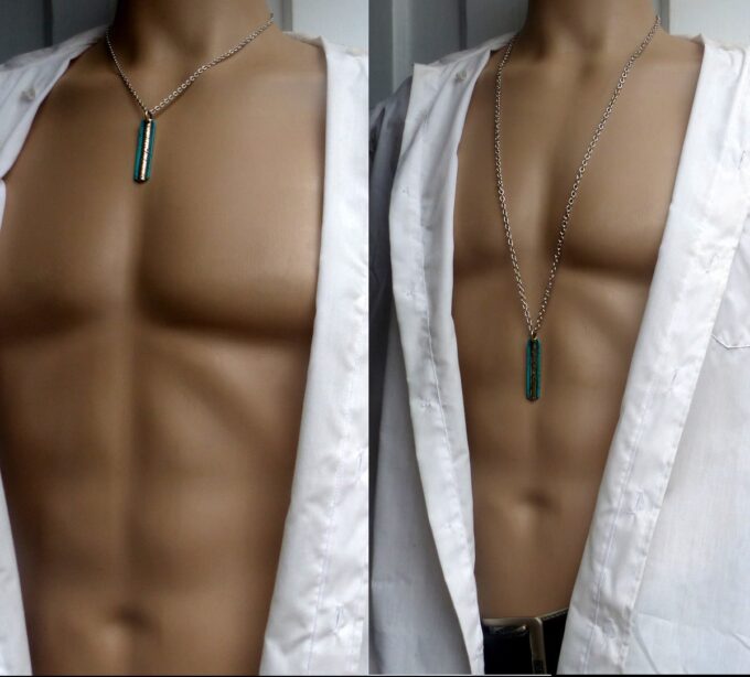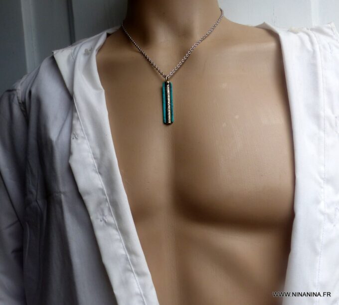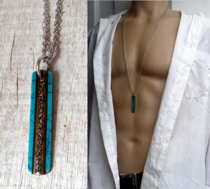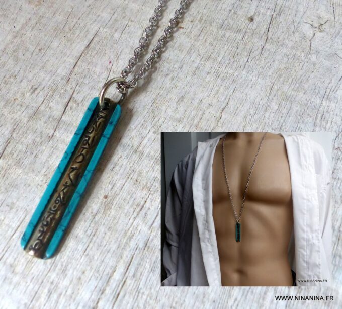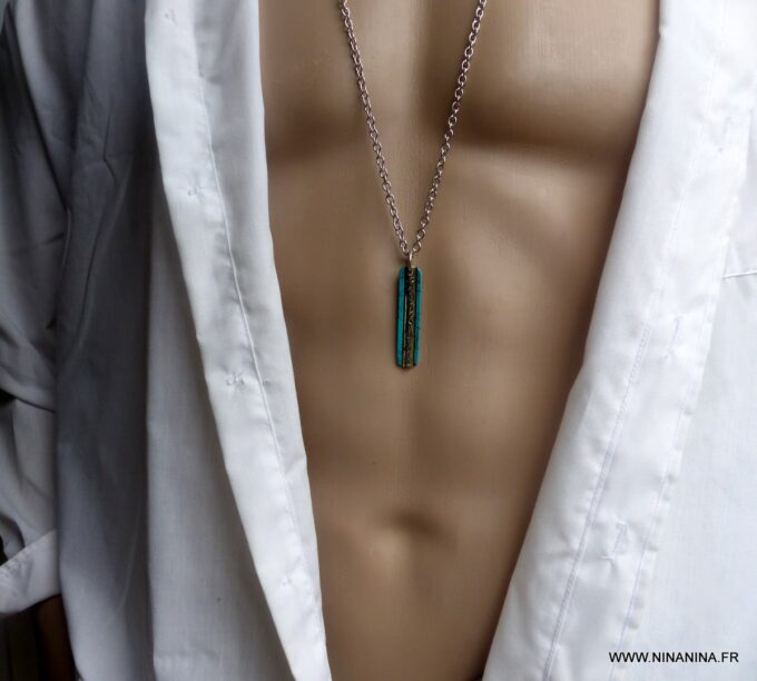 Ce collier porte bonheur homme en turquoise naturelle et Acier inoxydable de haute qualité est fabriqué à la main, de façon artisanale et en série limitée dans notre atelier du sud de la France. Dim du pendentif : 3,5 X 0,7 cm. Subtil alliage de plusieurs éléments (le fer, le nickel ou le chrome), l’Acier inoxydable est un matériau particulièrement prisé pour ses nombreuses vertus. Il est très solide et robuste, totalement hypoallergénique, ne rouille pas et, contrairement à l’Agent, ne s’oxyde pas.