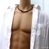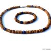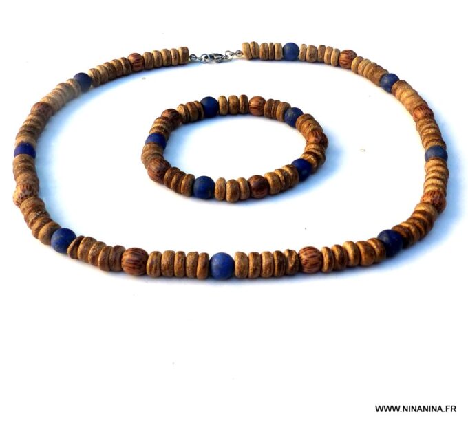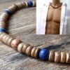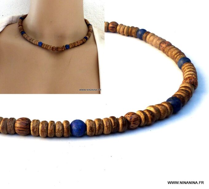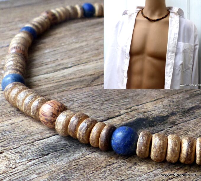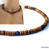 Collier homme perles bois coco lapis lazuli composé de perles lapis lazuli rondes mat, de rondelles et de perles de bois marron clair montées sur un cordon coton.