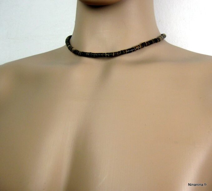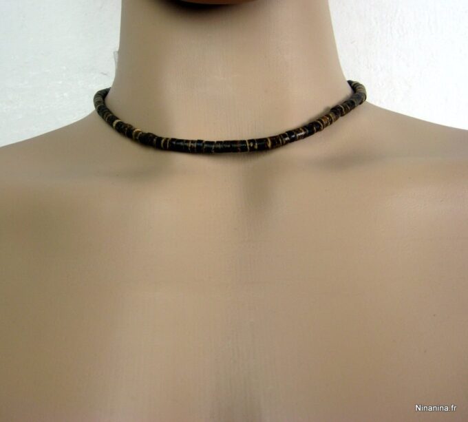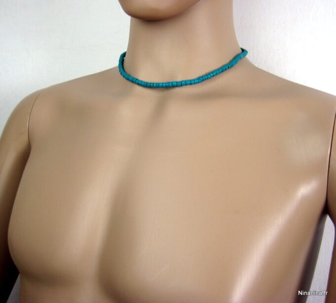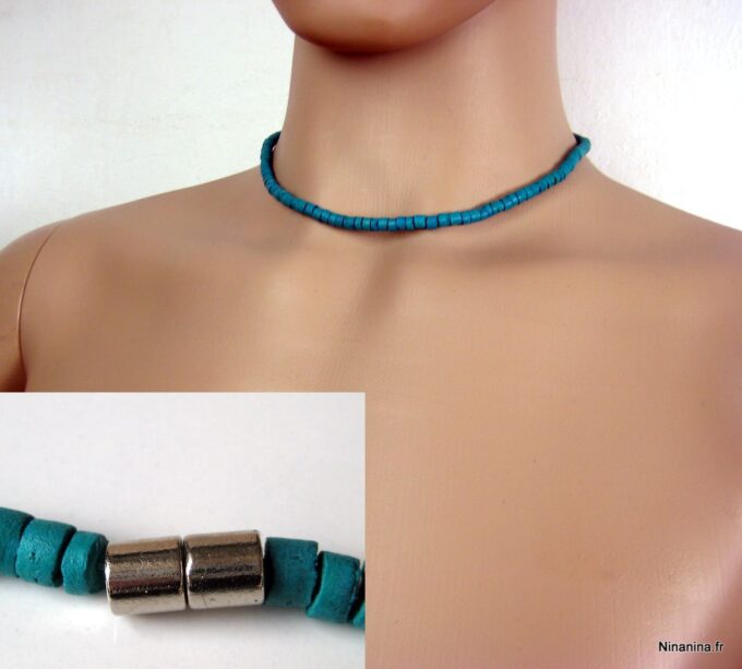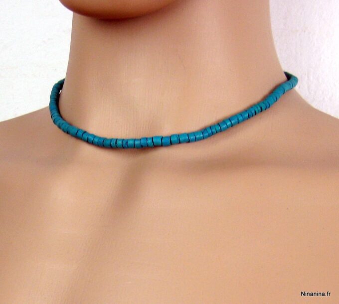 Collier homme perles de coco composé de rondelles de coco montées sur un fermoir cylindrique aimanté en acier inoxydable. Diamètre des rondelles : 0,5 cm. Existe en turquoise et en marron chocolat. Longueur : 44 cm env. Livré dans sa pochette d’organza. Bijou 100% fait-main.