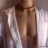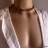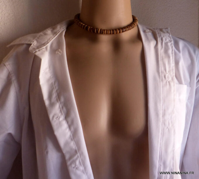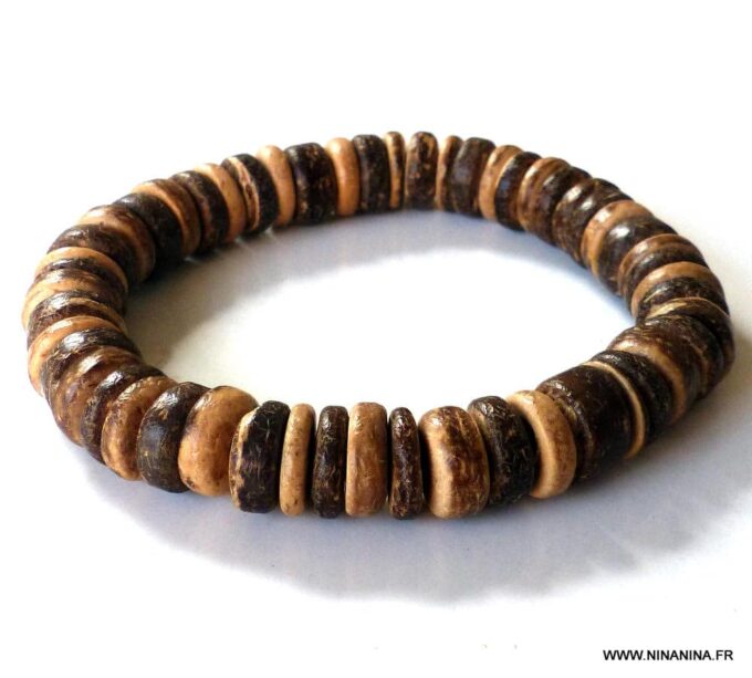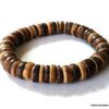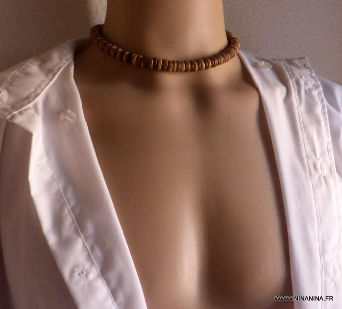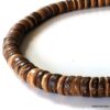 Collier homme elastique perles bois marron composé de rondelles de bois marron chocolat et naturel montées en alternance sur un lien elastique.