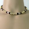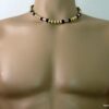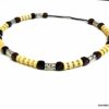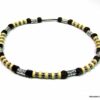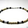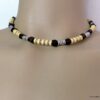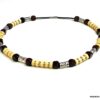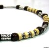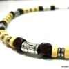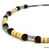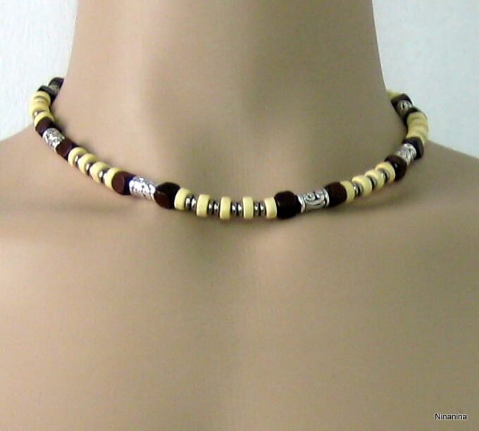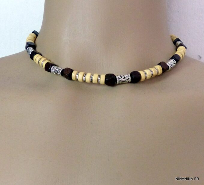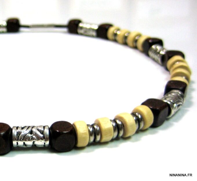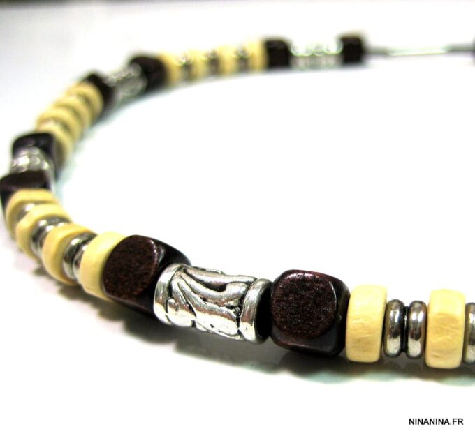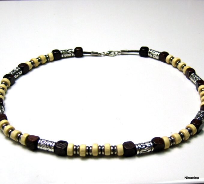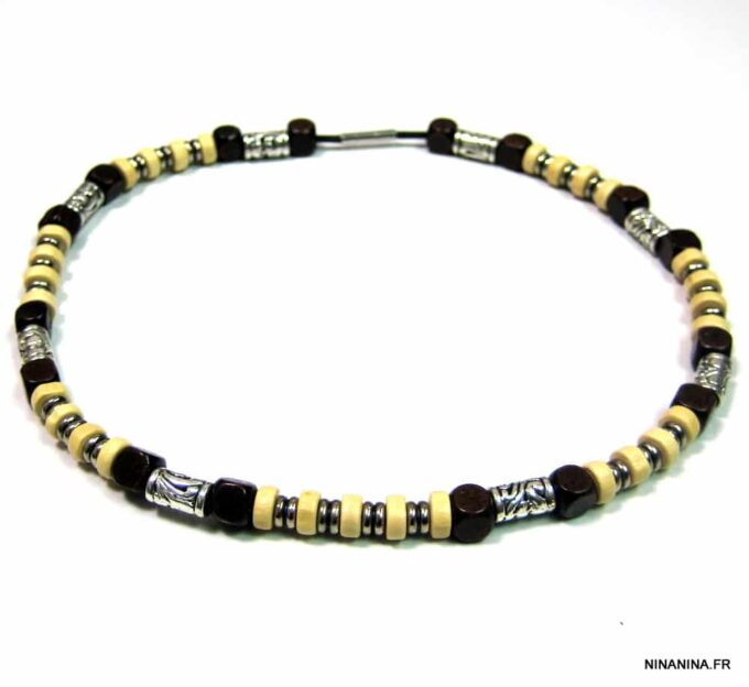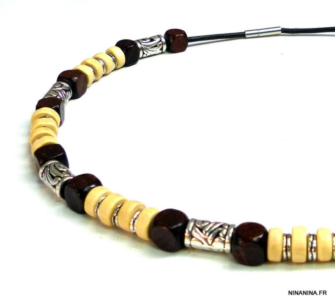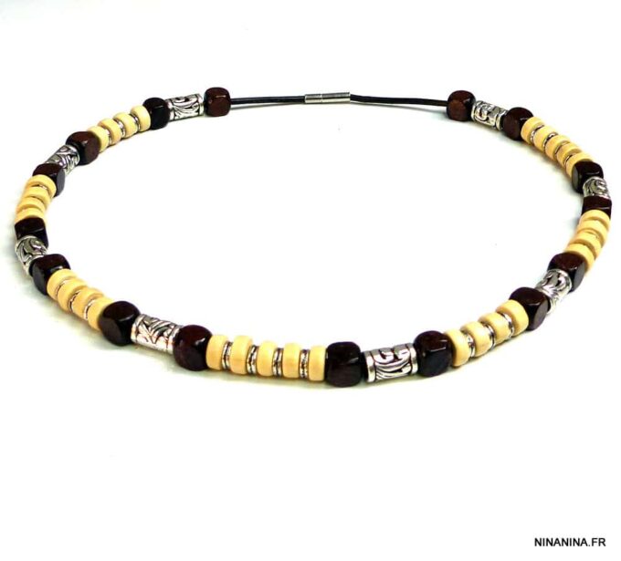 Collier cordon cuir perles de bois composé de rondelles, de perles de bois marron chocolat et naturel et de bagues en métal argenté montées sur un cordon de coton ciré. Fermoir mousqueton. Longueur : 44 cm env. Livré dans sa pochette d’organza.