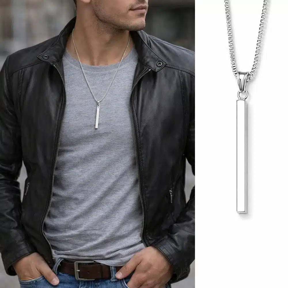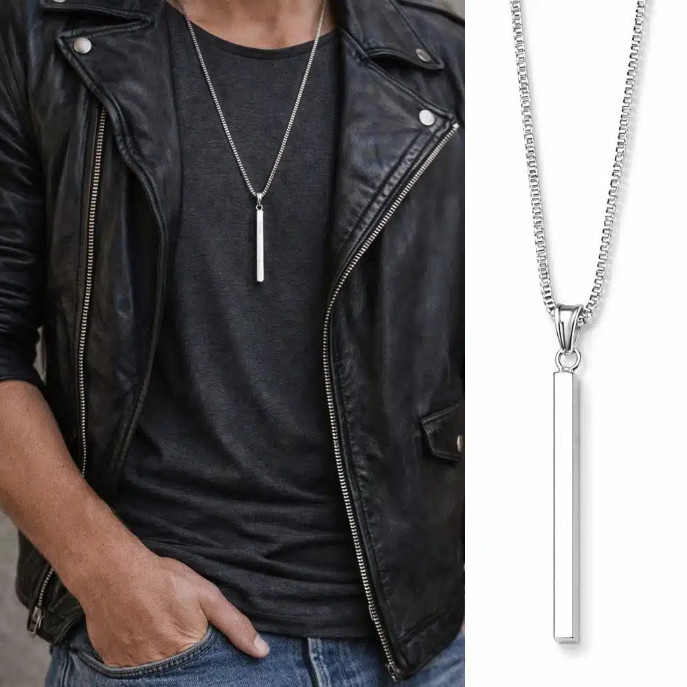 Le collier homme pendentif barre plaqué argent est l’expression parfaite d’un style moderne, sobre et élégant.
