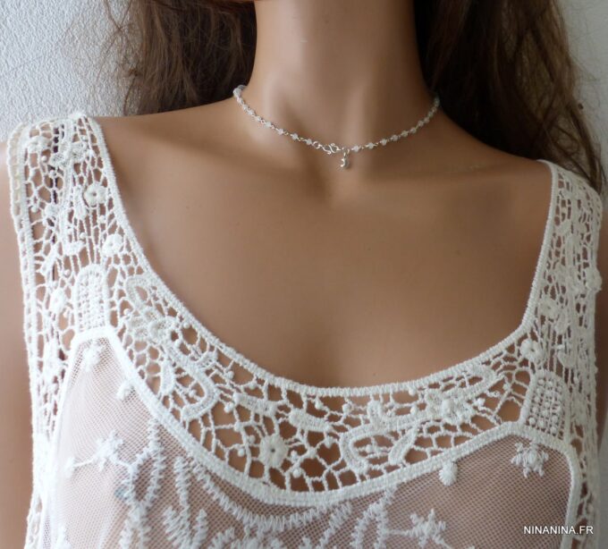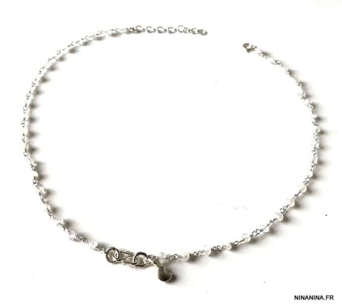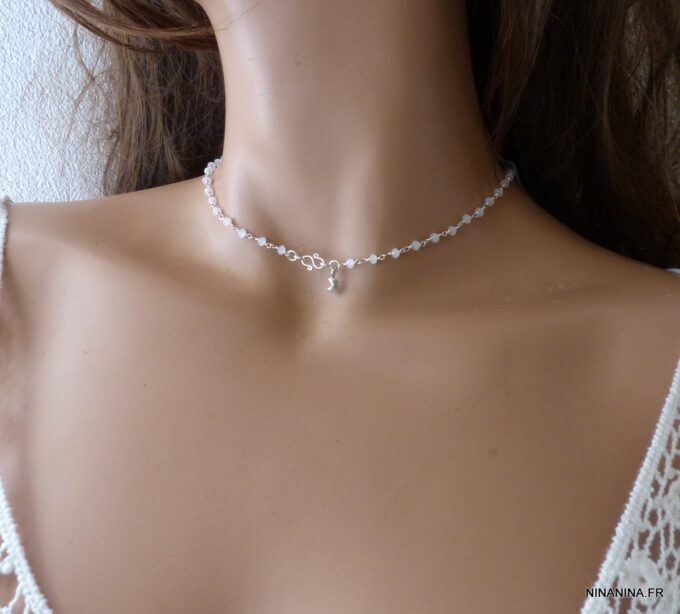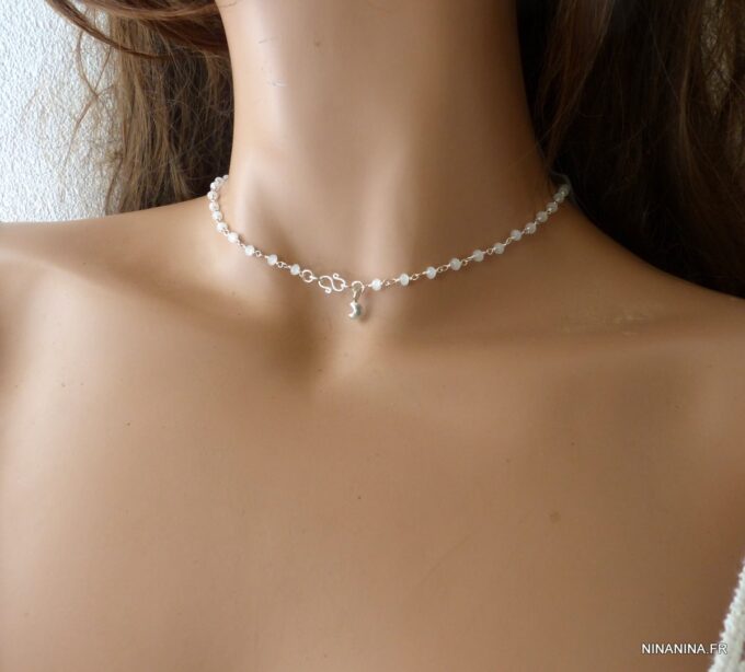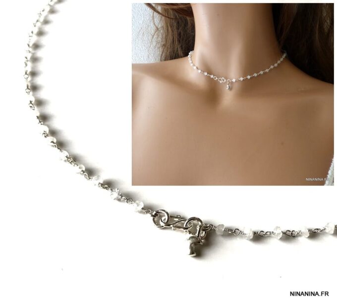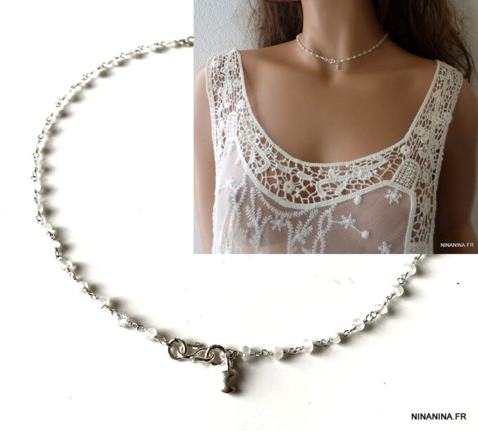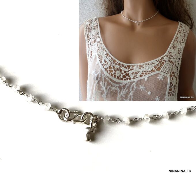 Portez ce joli ras de cou pierre de lune et argent seul pour un look minimaliste ou en superposition avec d’autres colliers Ninanina profitez des vertus de cette pierre semi précieuse : La Pierre de lune est une Pierre très calmante, apaisante, c’est un anti-stress. Elle stimule l’imagination, apporte douceur et sensibilité, développe l’intuition, l’imagination.