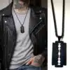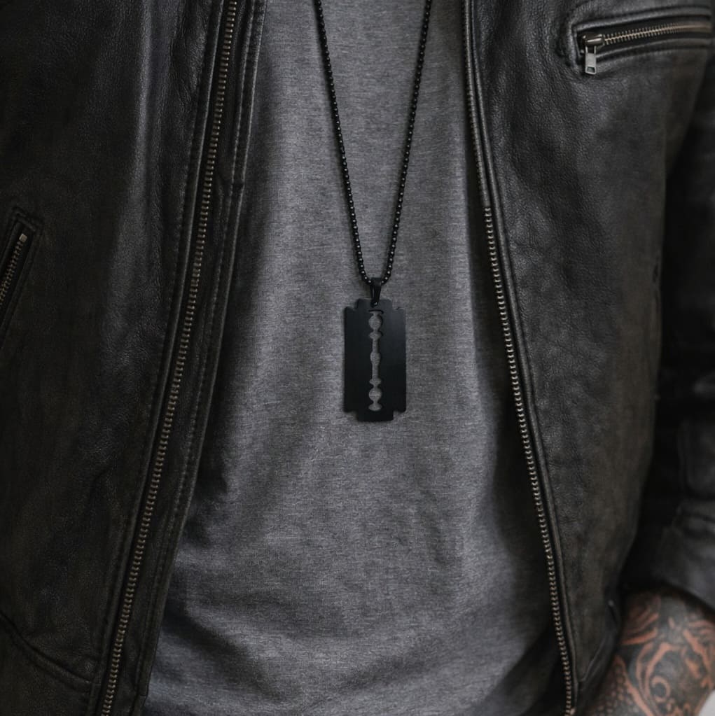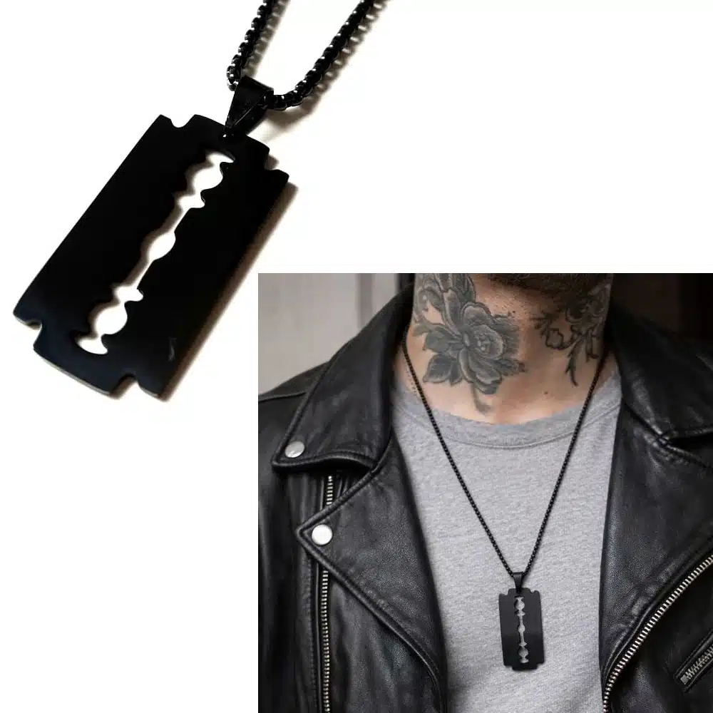 Affirmez votre style avec ce collier artisanal orné d’un pendentif lame de rasoir en acier inoxydable noir. Un bijou au design brut, moderne et résolument masculin.