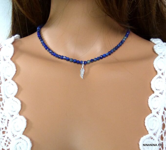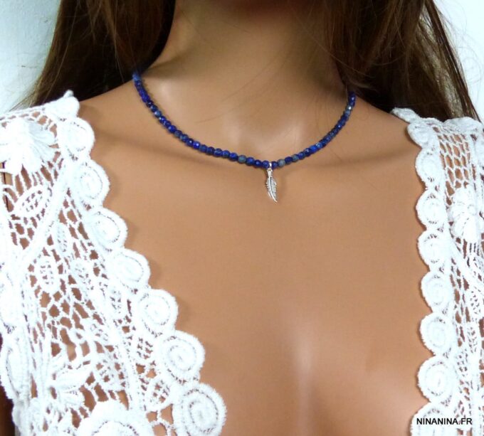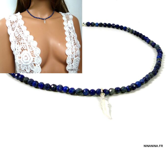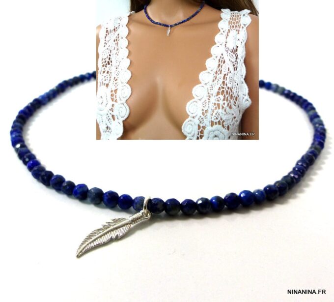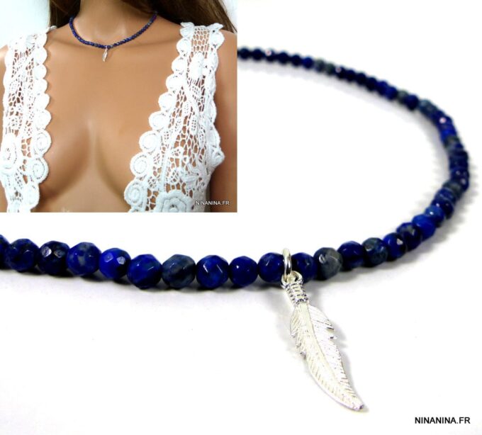 Collier plume Argent 925 massif et Lapis Lazuli composée d’une perle en argent massif montée sur un rang de perles facettées lapis lazuli. Dim de la plume : 2,5 X 0,5 cm. Diamètre des perles : 0,4 cm. Fermoir mousqueton en argent 925.  Longueur (fermoir compris) : 40 cm env. Livré dans sa pochette d’organza.