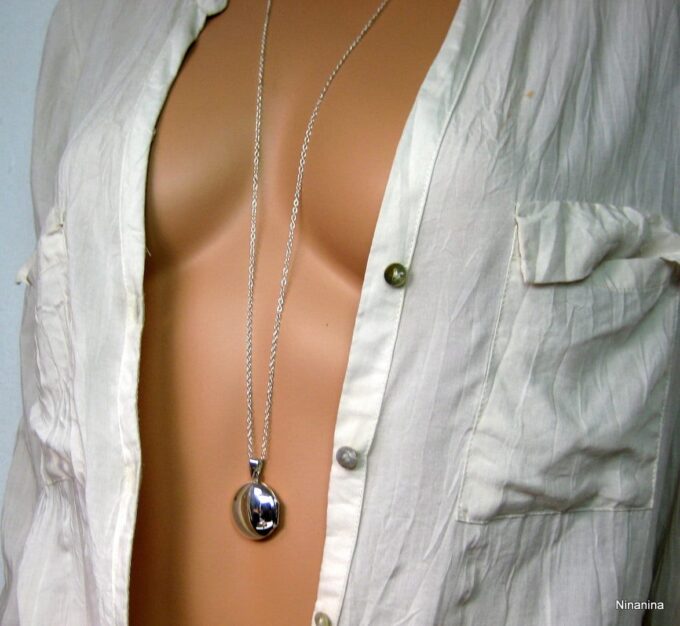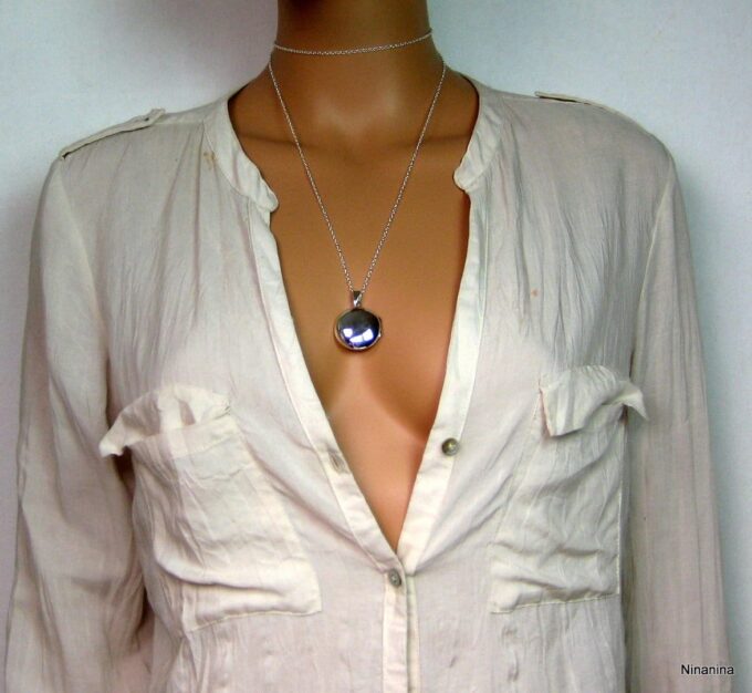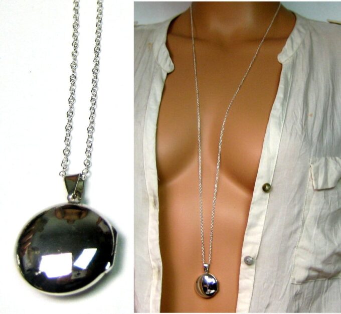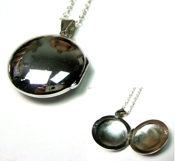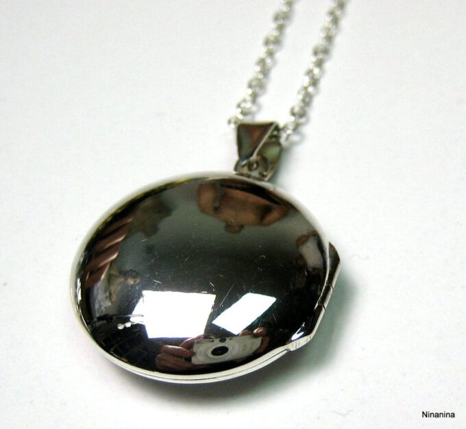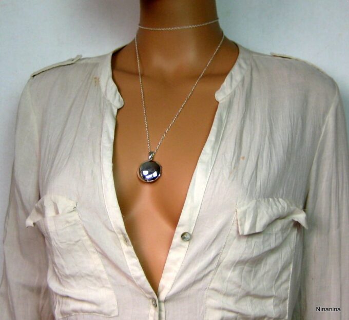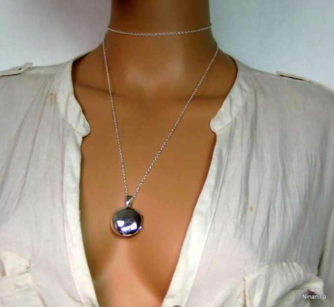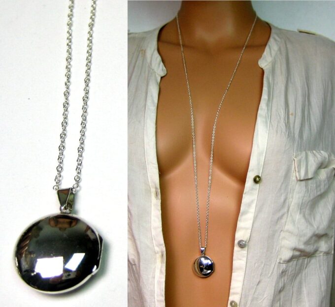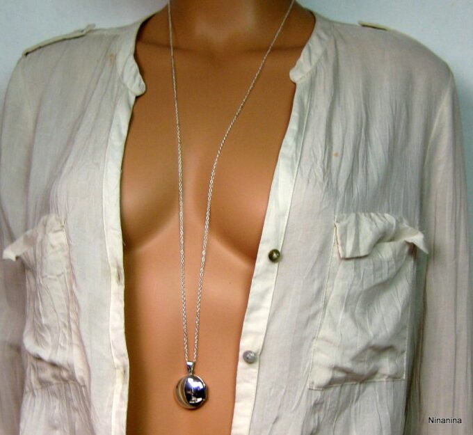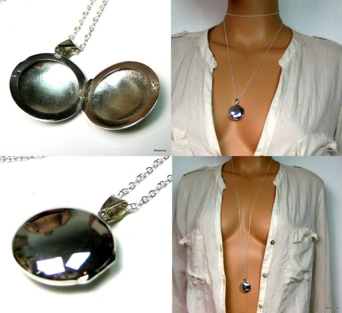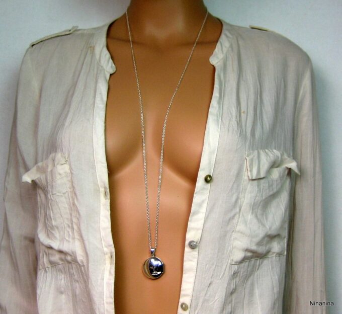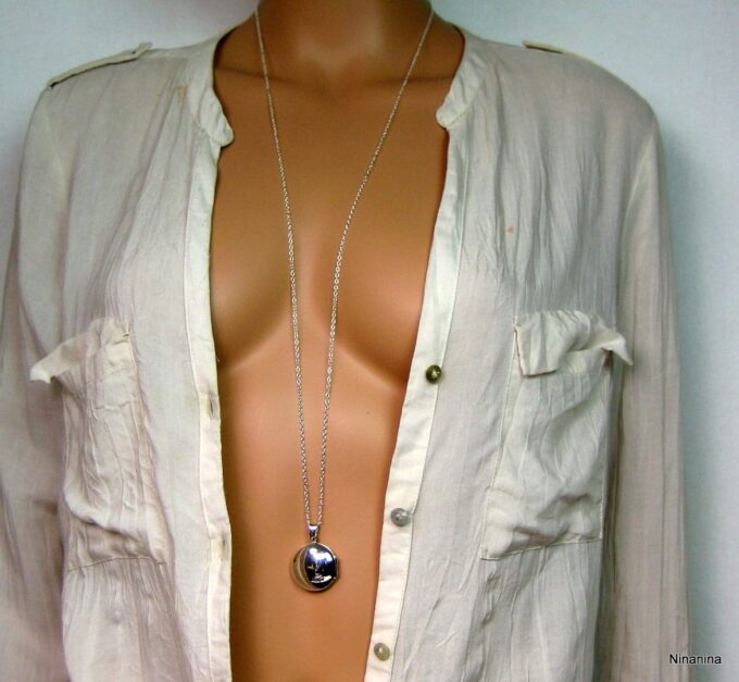 Un grand classique mais un intemporel, ce Collier long pendentif porte photo Argent 925 massif composé d’un pendentif rond porte-photo en argent 925 monté sur une chaînette (1mm de diamètre) en argent 925.
