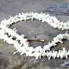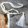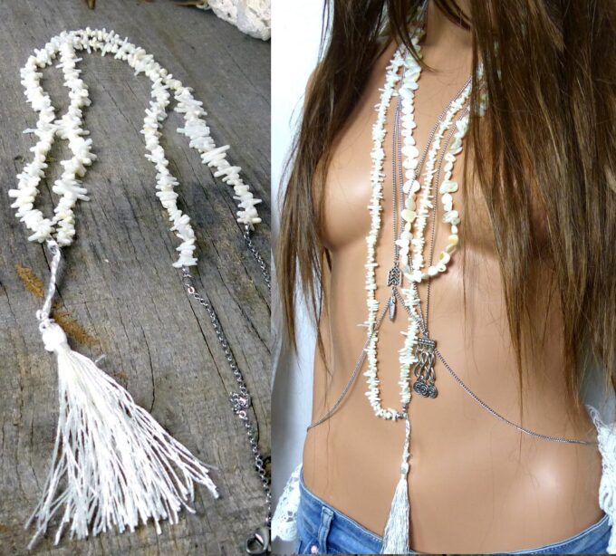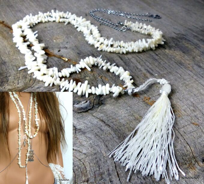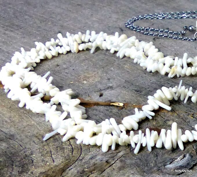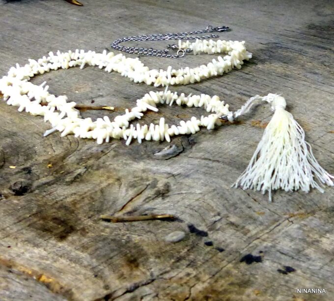 Collier long corail blanc pompon composé de ships de corail blanc et d’un pompon blanc cassé montés sur une chainette en acier inoxydable. Longueur du pompon : 9 cm. Diamètre de la pièce : 2 cm.