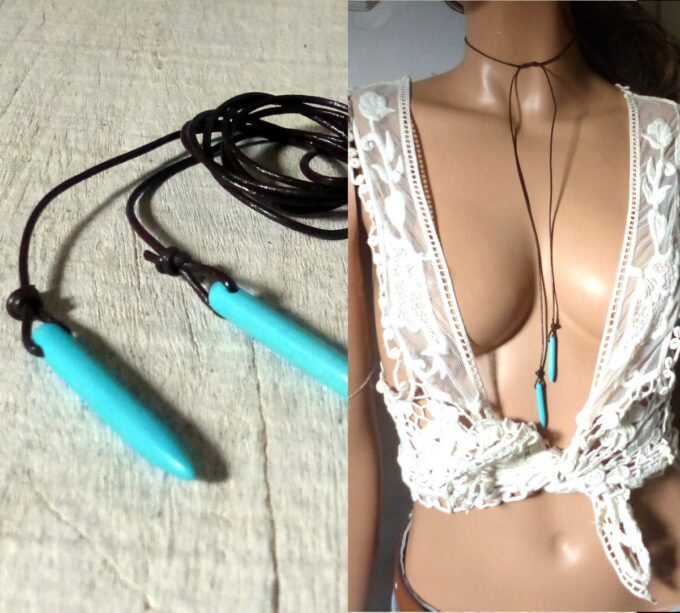 Collier long femme cordon cuir pendentifs turquoises composé de deux pendentifs aiguille en magnésite turquoise montés sur un lacet de cuir naturel (1,5 mm de diamètre), à enrouler autour du cou.
